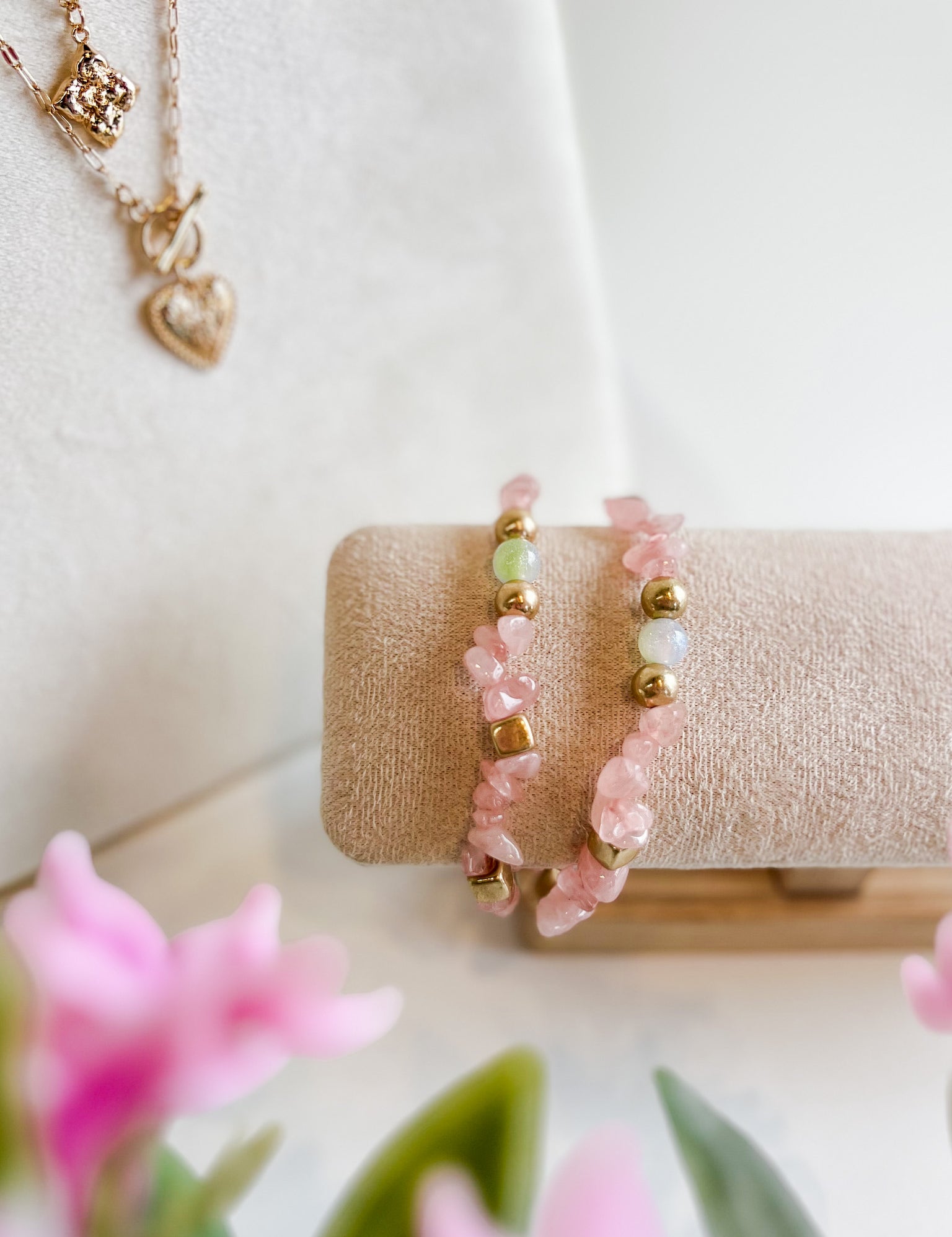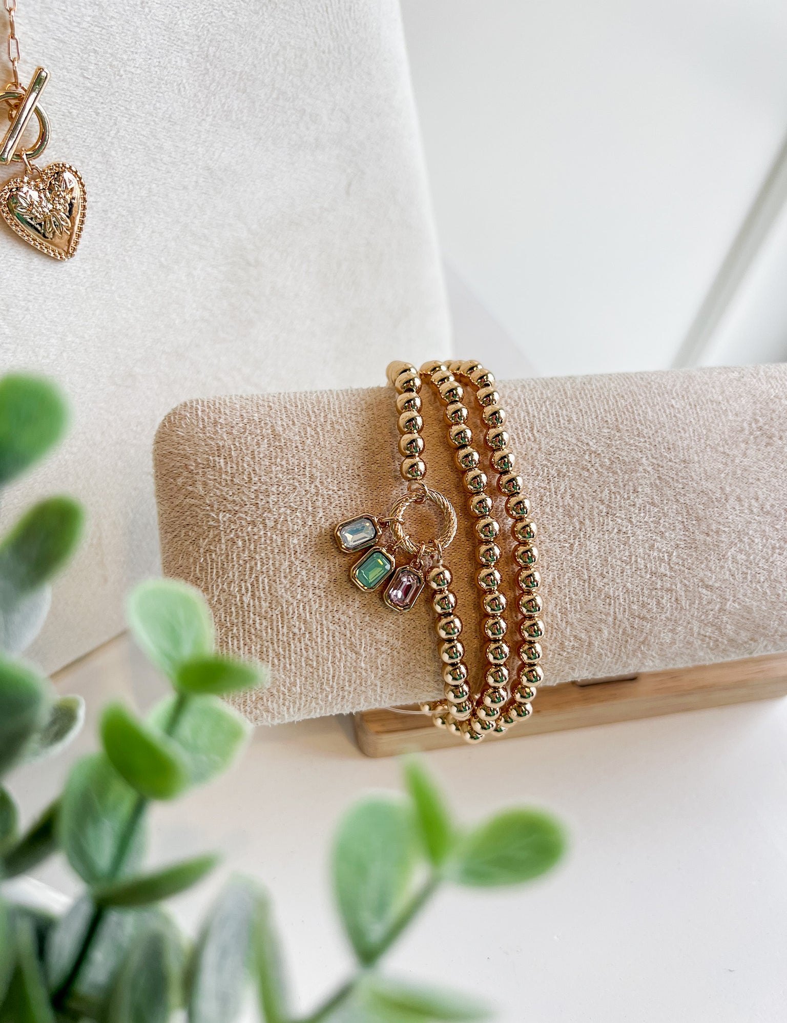 Gold Beaded Stretch Bracelet with Mini Gem Charms