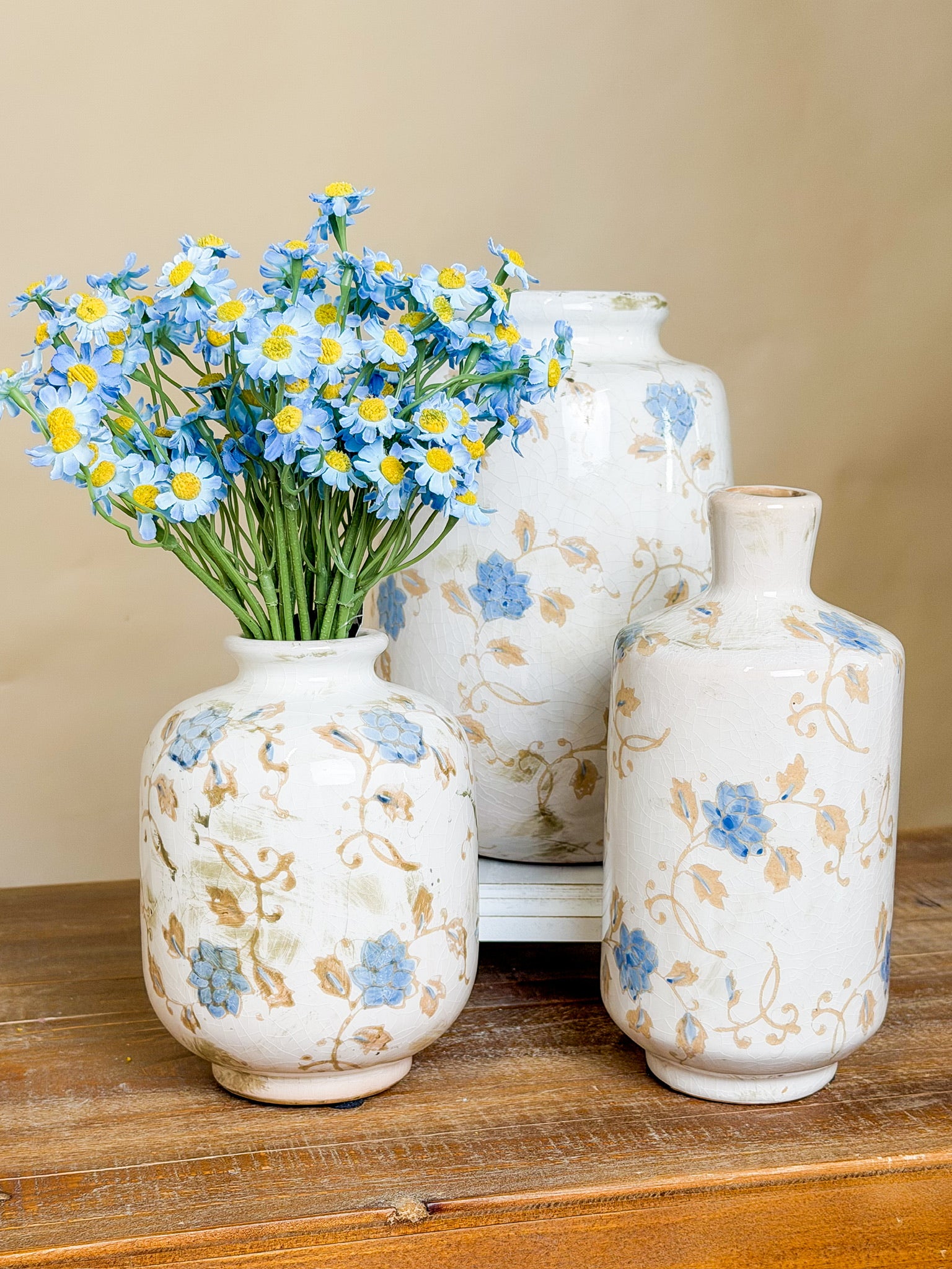 This faux blue daisy bundle features soft blue petals with sunny yellow centers for a fresh, cheerful look. Perfect styled on its own in a small vase or layered with other stems for a fuller arrangement.