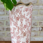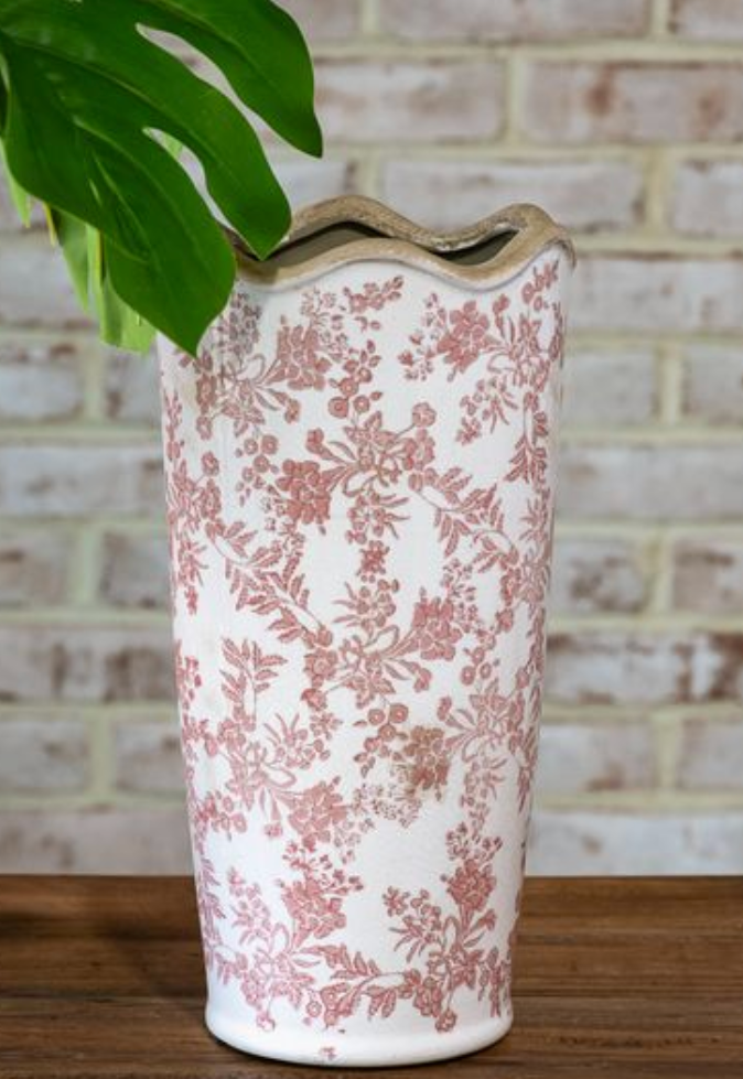This heirloom-inspired vase features a soft floral pattern and a gently scalloped rim for a timeless, collected look. Beautiful styled on its own or filled with faux stems, it adds an easy layer of charm to shelves, consoles or tabletops.