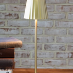 This mini table lamp features a slim gold base paired with a pleated metal shade for a refined, vintage-inspired look. Perfect for adding a warm glow to shelves, desks or bedside tables without taking up much space.