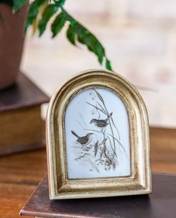 This mini arch-shaped frame features a warm antique brass finish and vintage-inspired detail for a timeless, collected look. Perfect for small artwork or photos and easy to style on shelves, nightstands or layered with books.