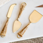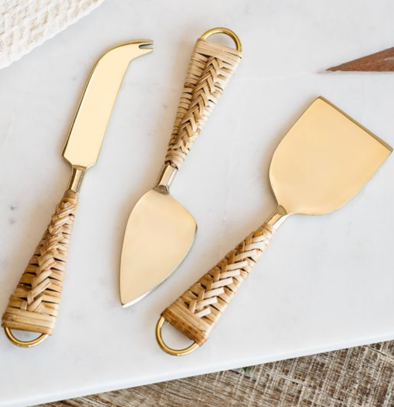 This three-piece cheese knife set features gold-toned blades paired with woven natural handles for a warm, collected look. Perfect for entertaining, charcuterie boards or styled on kitchen counters for a touch of texture.