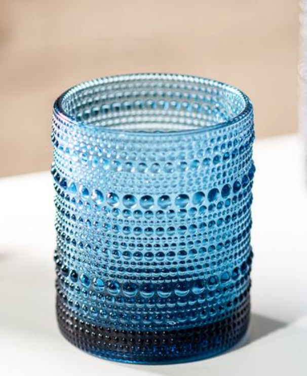 This blue drinking glass features a textured hobnail design that adds visual interest while remaining easy and timeless. Perfect for everyday use or styling on open shelving for a pop of color.