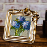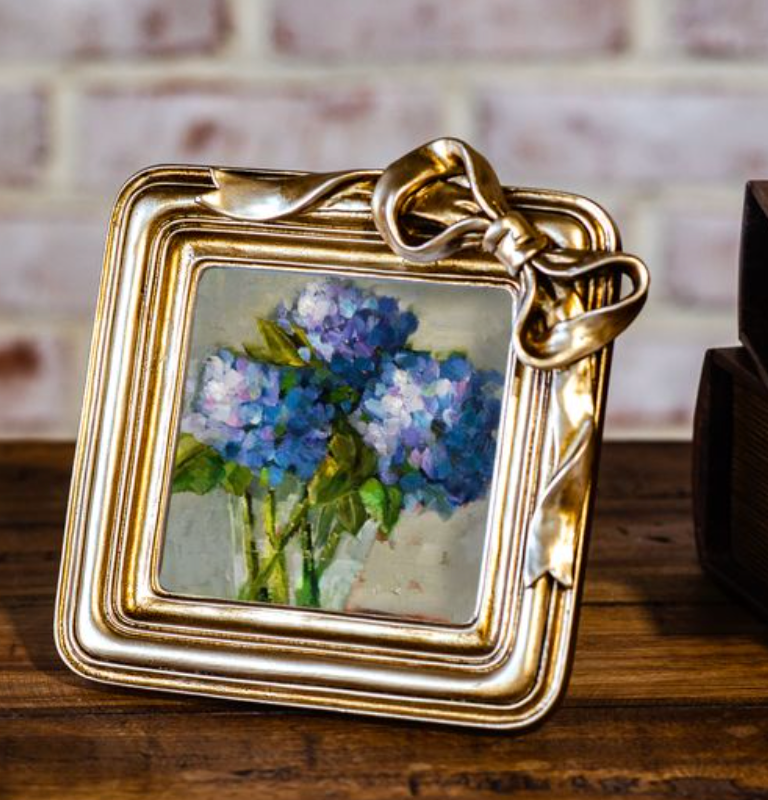 This square photo frame features a warm gold finish with a sculpted bow detail for a charming, vintage-inspired look. Perfect for displaying favorite photos or small art prints on shelves, nightstands or layered vignettes.