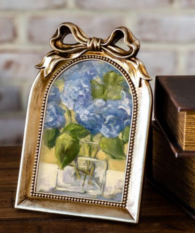 This arch-shaped photo frame features a warm gold finish with a sculpted bow detail and beaded trim for a timeless, vintage-inspired look. Beautiful for displaying favorite photos or art prints on shelves, nightstands or layered vignettes.