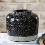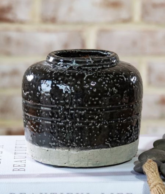 This ceramic vase features a rich black glaze with subtle texture and a contrasting neutral base for a modern, grounded look. Perfect styled on its own or layered with books and accents on shelves or consoles.