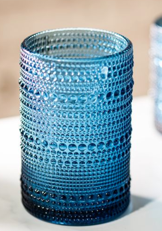 This blue drinking glass features a textured hobnail design that adds depth and interest while remaining timeless and easy to style. Perfect for everyday use or displayed on open shelving for a pop of color.