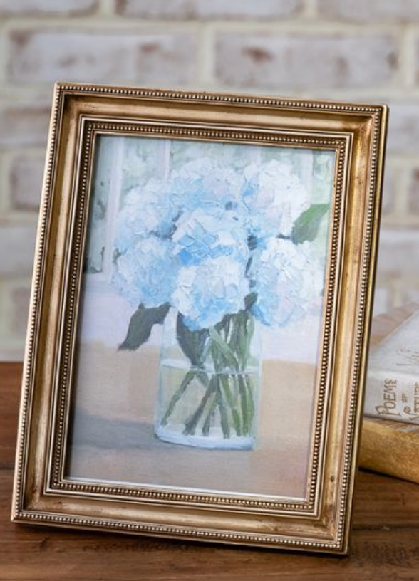 This photo frame features a warm antique gold finish with delicate beaded detailing for a timeless, collected look. Beautiful for displaying favorite photos or art prints on shelves, desks or layered vignettes.