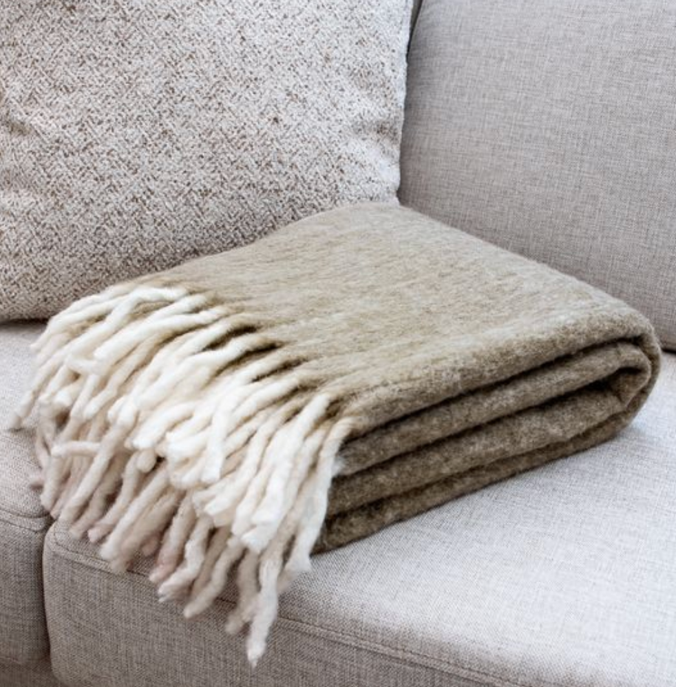 This soft throw blanket features a warm neutral tone and classic fringe edges for an inviting, layered look. Perfect for draping over a sofa or chair to add texture and comfort to any space.