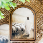 A peaceful reminder of who walks ahead of us. This 6 x 8 arched framed print features a soft, reverent image of Jesus leading His sheep through open fields, creating a quiet and meaningful statement for your home.