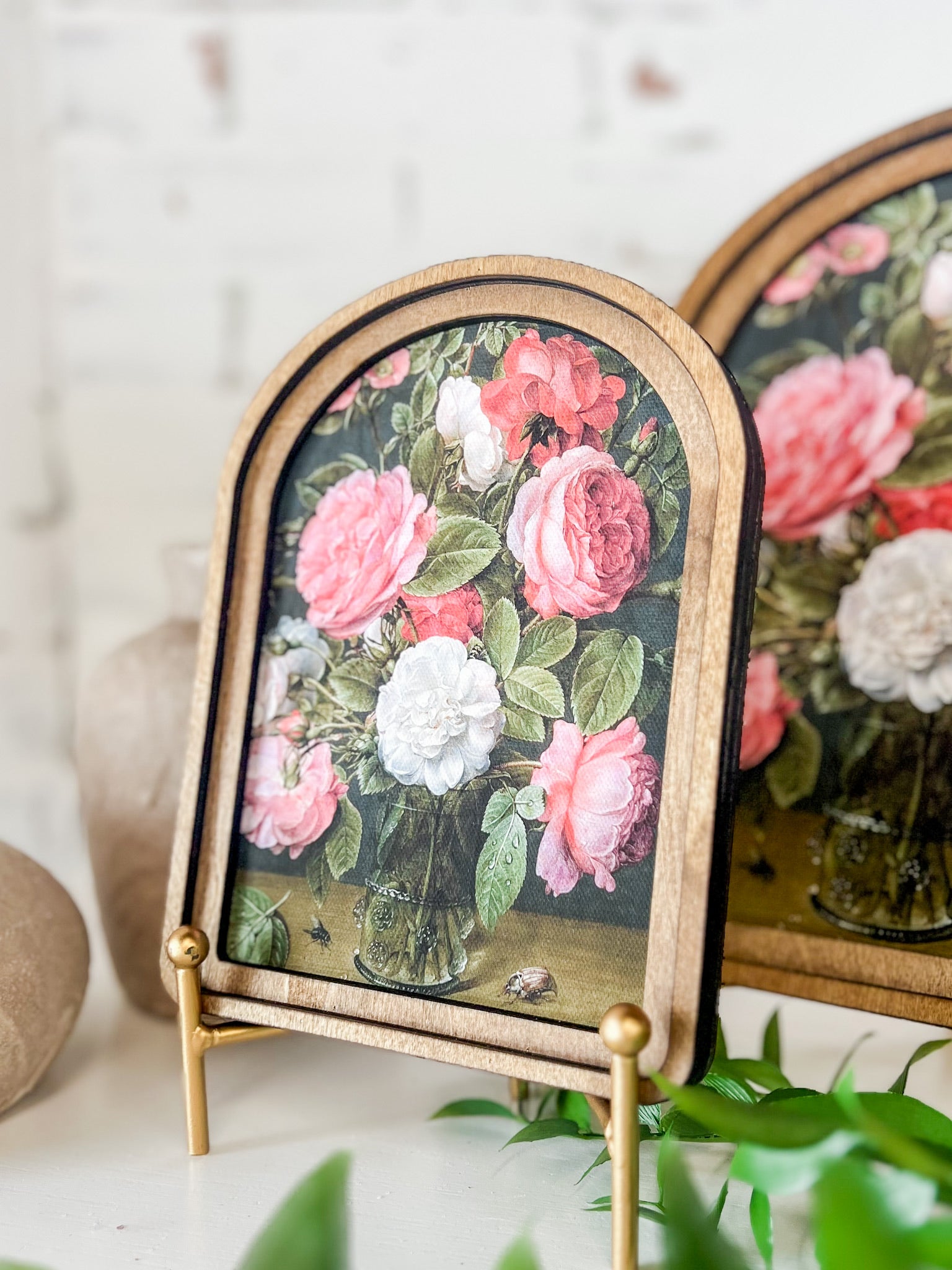 The warm wood frame and classic arched silhouette add softness and architectural detail, making it easy to style on shelves, mantels or layered into a gallery wall. Its smaller size makes it perfect for tucking into styled spaces, and it can hang with an adhesive strip or sit upright for effortless decorating. Proudly Made in the USA, this piece blends quality craftsmanship with statement-making floral beauty.