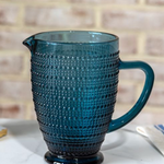 This blue glass pitcher features a textured hobnail-style design with a classic handle and spout for a timeless cottage-inspired look. Beautiful styled on open shelving, kitchen counters or used as a decorative vase with faux stems.