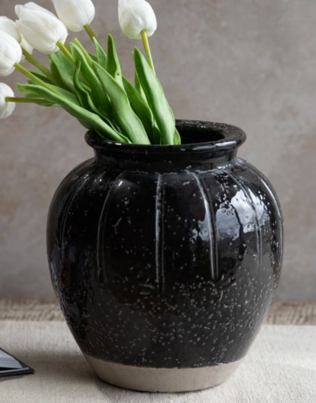 This ceramic vase features a rich black glaze with subtle speckled texture and a contrasting neutral base for a modern, collected look. Beautiful styled as a statement on its own or filled with faux stems on consoles, shelves or tabletops.