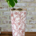 This heirloom-style vase features a soft red floral pattern and a gently scalloped rim for a timeless, collected look. A beautiful accent for shelves, mantels or tabletops, styled on its own or with faux stems.
