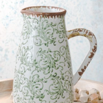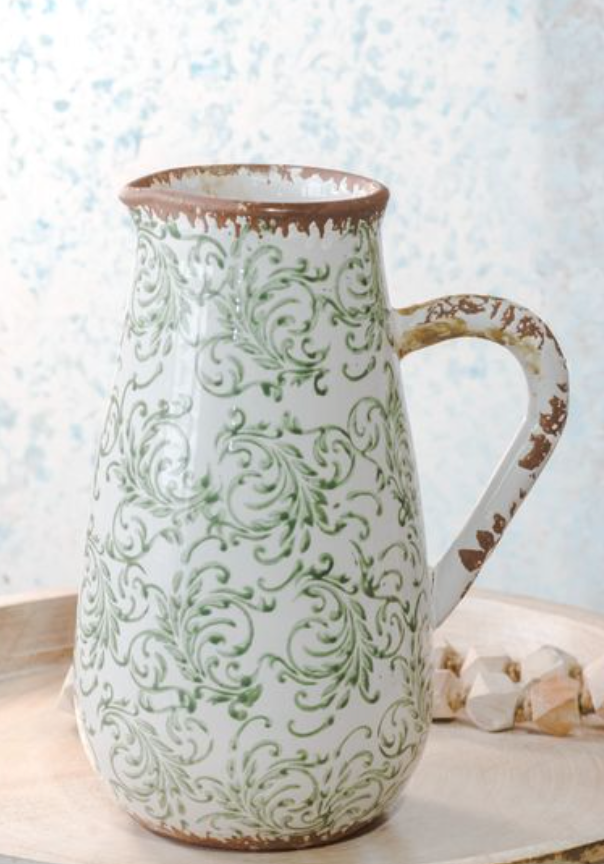 This heirloom-style pitcher features a soft green scroll pattern with lightly distressed edges for a timeless, collected look. Beautiful styled on open shelving, entry tables or used as a decorative vase with faux stems.