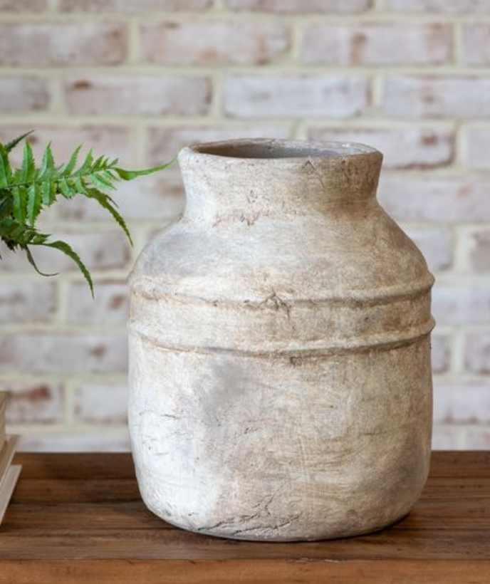 This stoneware vase features a softly weathered finish with subtle texture for a collected, old-world look. Beautiful styled on its own or filled with faux stems on consoles, shelves or tabletops.