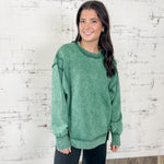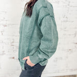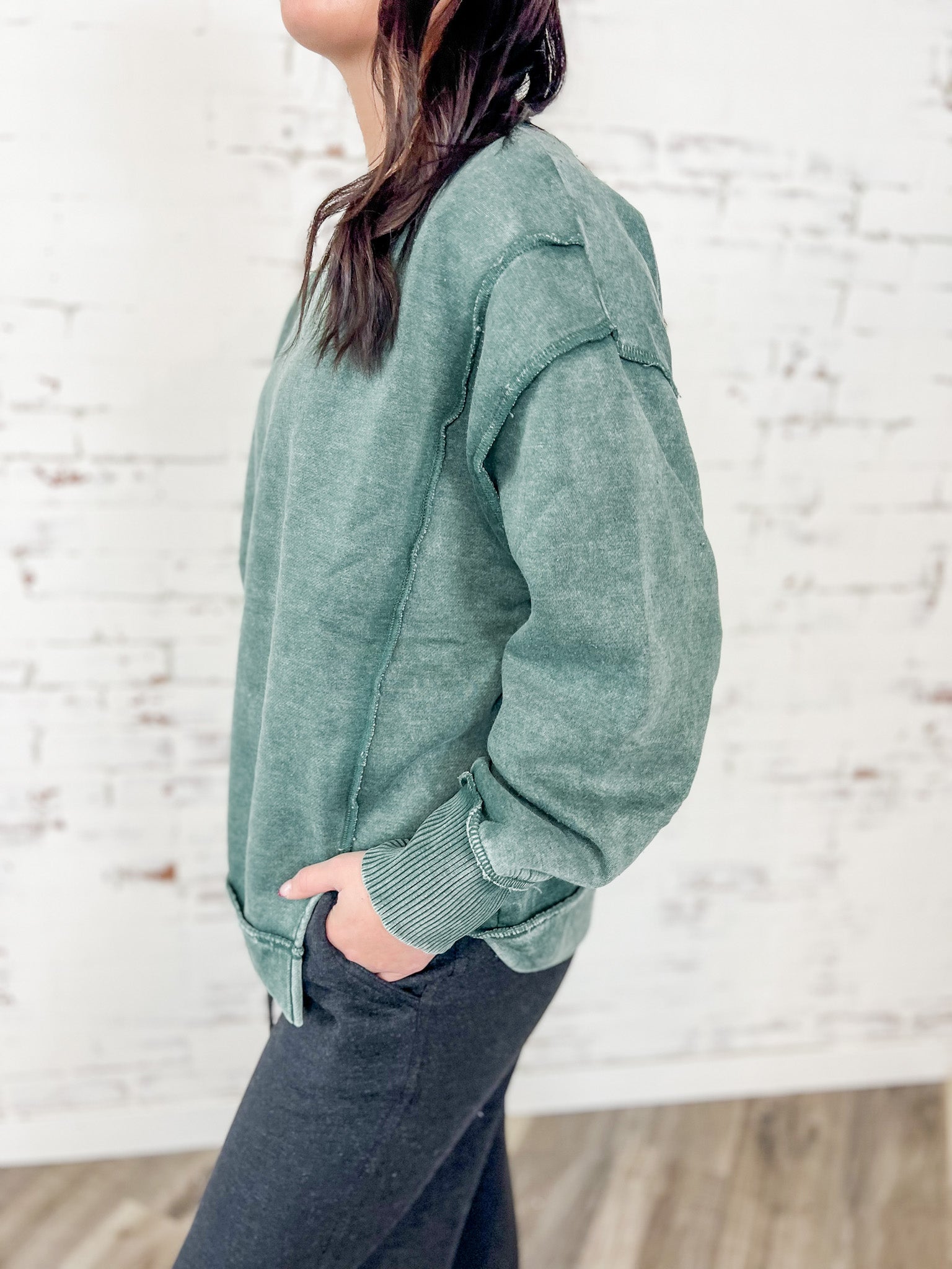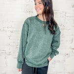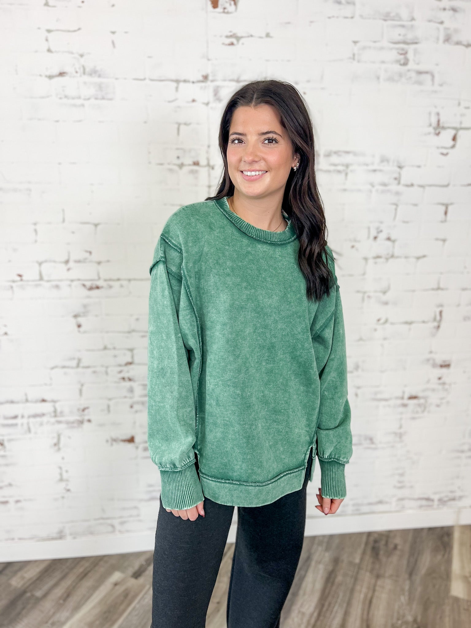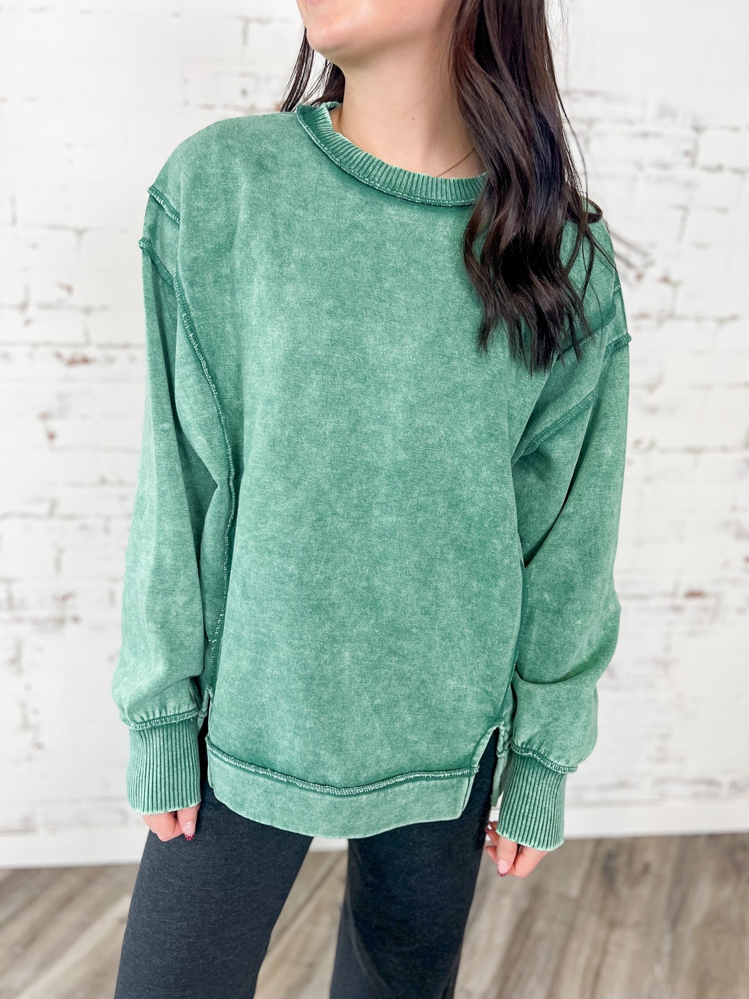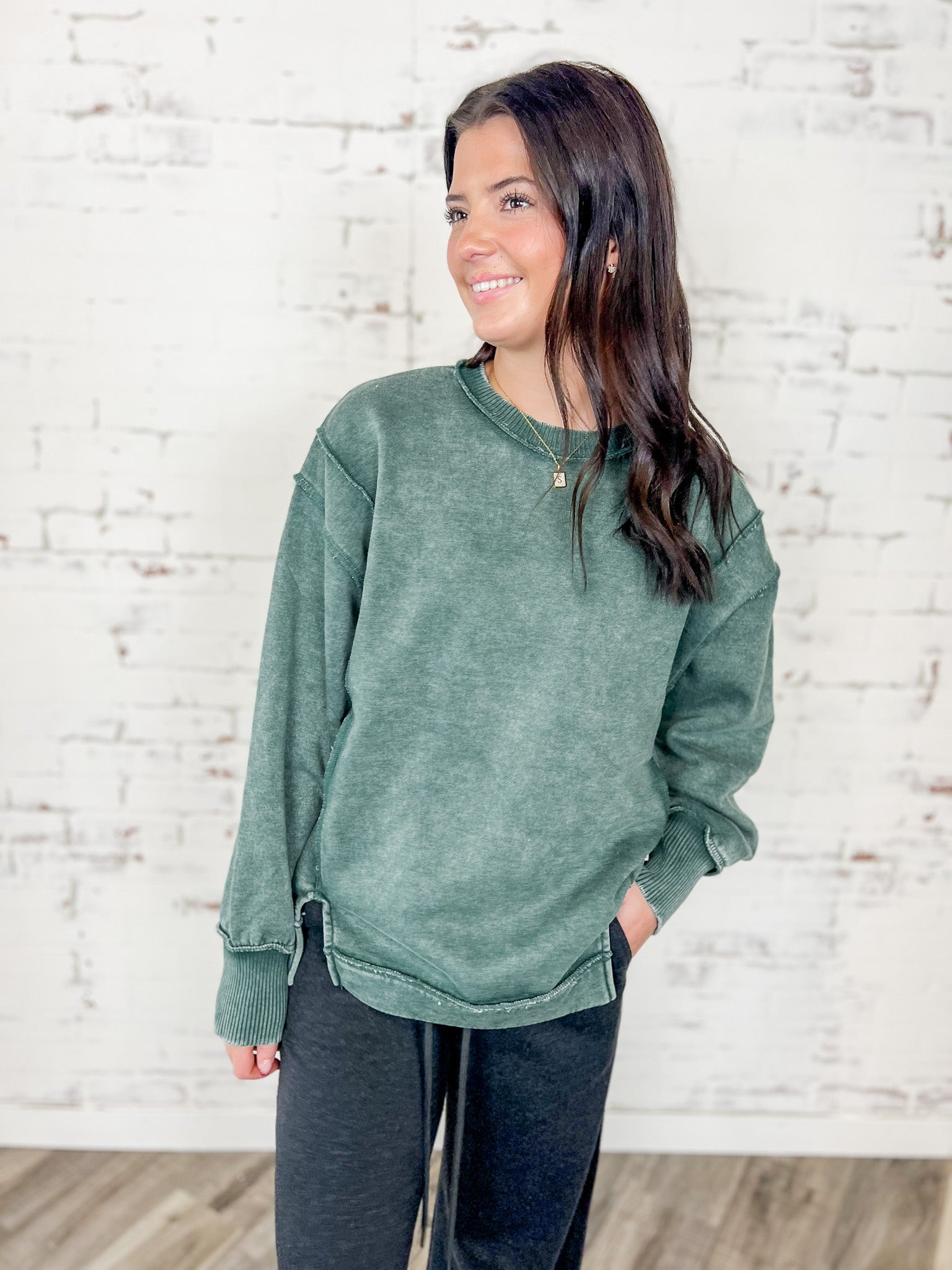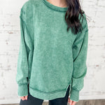 Meet your new go-to for school runs, slow mornings, and everything in between. This washed green pullover has that perfectly broken-in look and feel — soft, lived-in, and just oversized enough for maximum comfort without feeling sloppy. Raw-edge seam details and ribbed cuffs give it that laid-back, boutique-style finish, while side slits add easy movement.