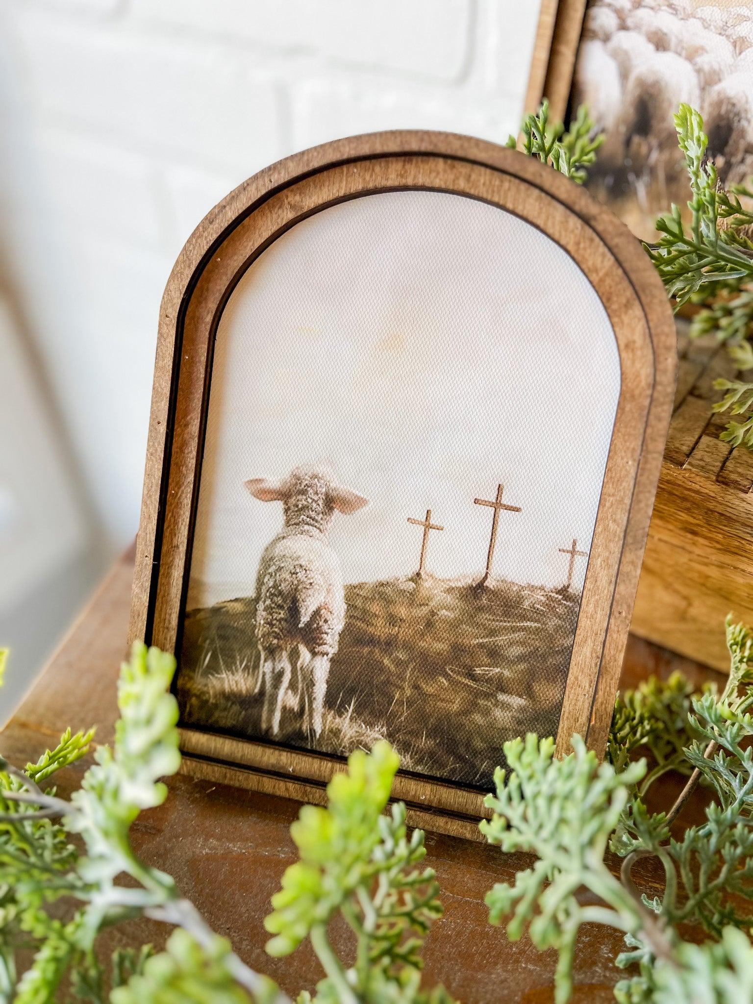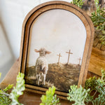 The custom frame shape gives the piece a vintage look. The artwork is printed onto canvas using beautiful Canon pigment inks. The canvas is mounted onto a wood backer. The top frame is laser cut birch wood stained in a neutral Early American tone. The entire piece is lightweight and easy to hang with an adhesive strip. (not included) You can also lean this artwork against a wall or other decor item to display it on a shelf or tabletop. It could also be displayed on an easel.