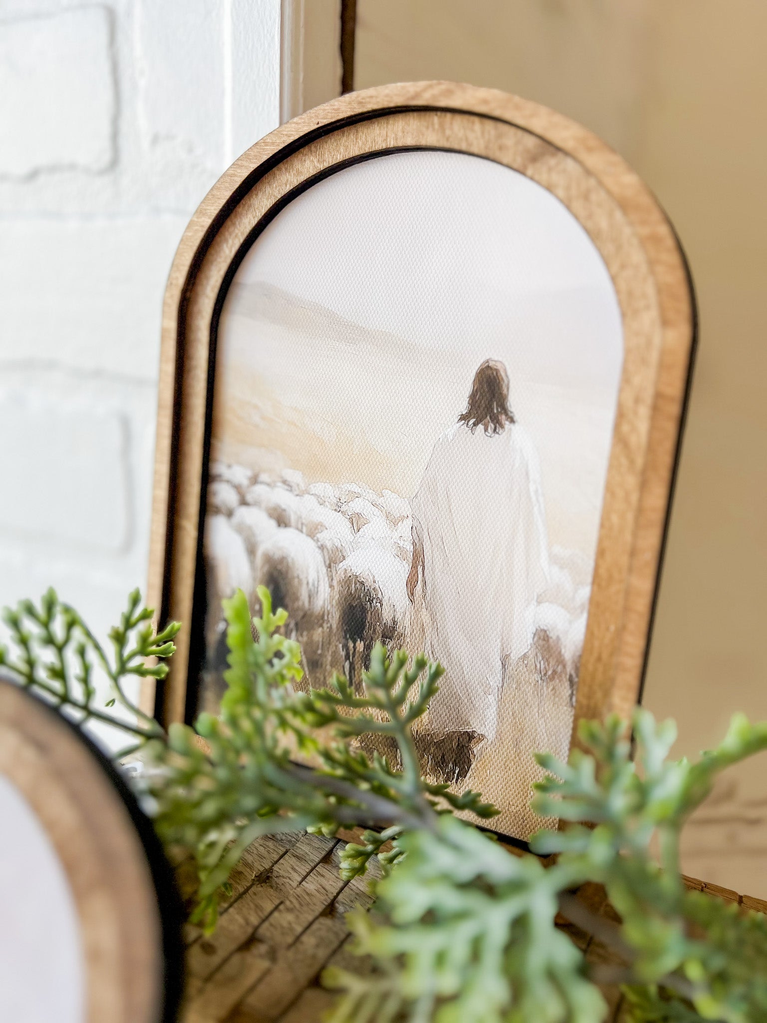The custom frame shape gives the piece a vintage look. The artwork is printed onto canvas using beautiful Canon pigment inks. The canvas is mounted onto a wood backer. The top frame is laser cut birch wood stained in a neutral Early American tone. The entire piece is lightweight and easy to hang with an adhesive strip. (not included) You can also lean this artwork against a wall or other decor item to display it on a shelf or tabletop. It could also be displayed on an easel.