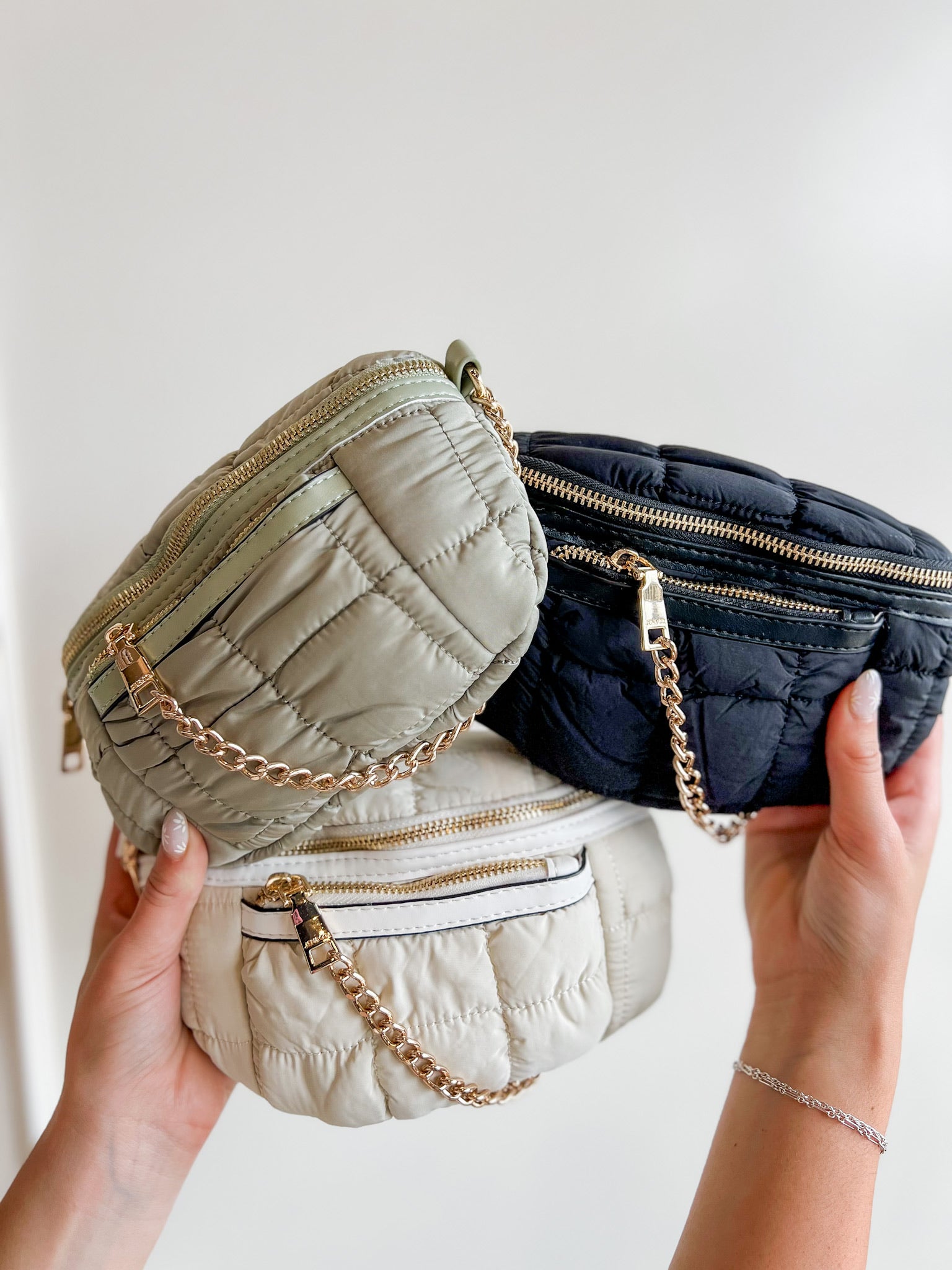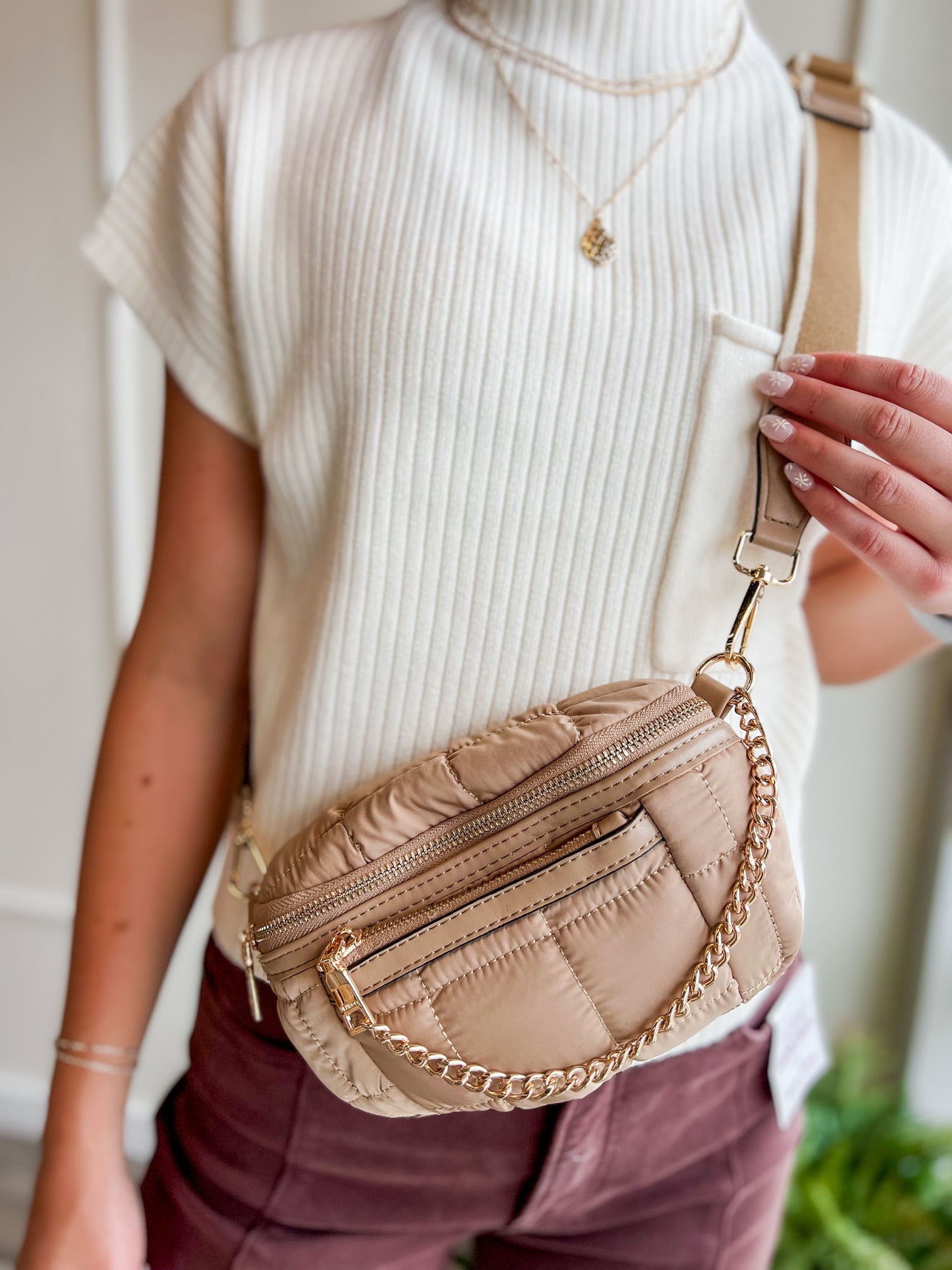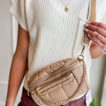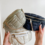 Trendy, hands-free, and perfect for on-the-go—this quilted belt bag is a must-have accessory. The gold chain detail adds a chic touch while keeping things practical for everyday wear.