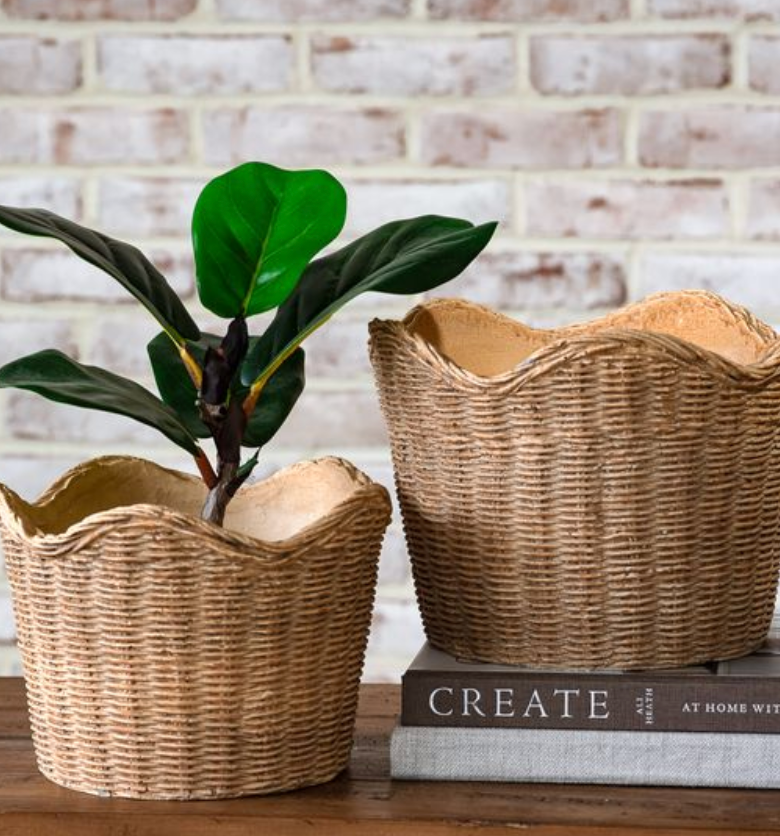 This polyresin planter features a woven basket look with a softly scalloped rim for a warm, natural feel—without the weight of real wicker. Perfect for faux greenery or decorative styling on shelves, consoles or tabletops.
