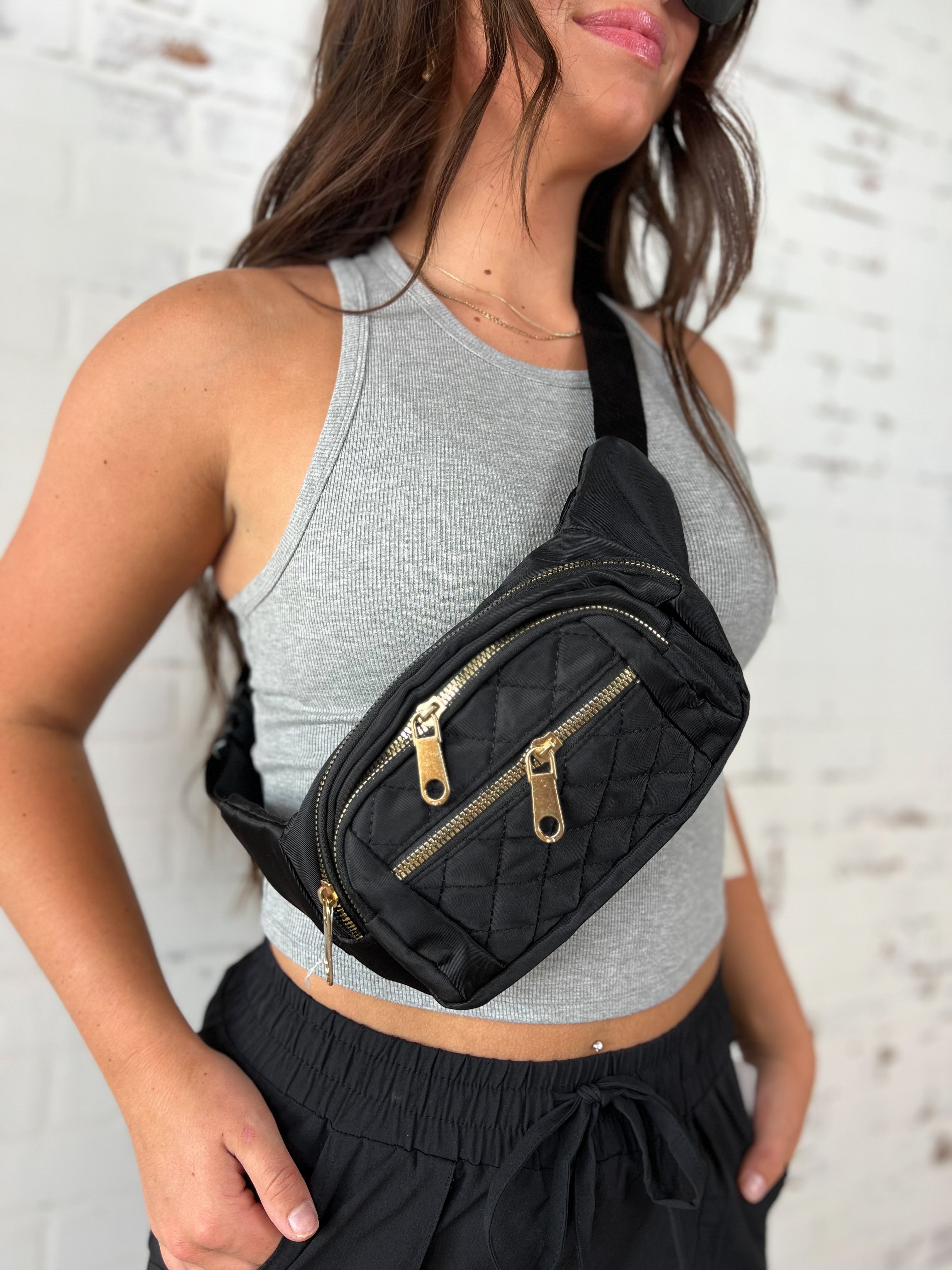 Go hands-free with our quirky Belt Bag! Made with quilted fabric and gold features, this crossbody bag is perfect for storing essentials on the go. No more holding onto your phone or wallet - just sling it over your shoulder and you're ready to conquer the day. (Don't worry, it's not a fanny pack.)