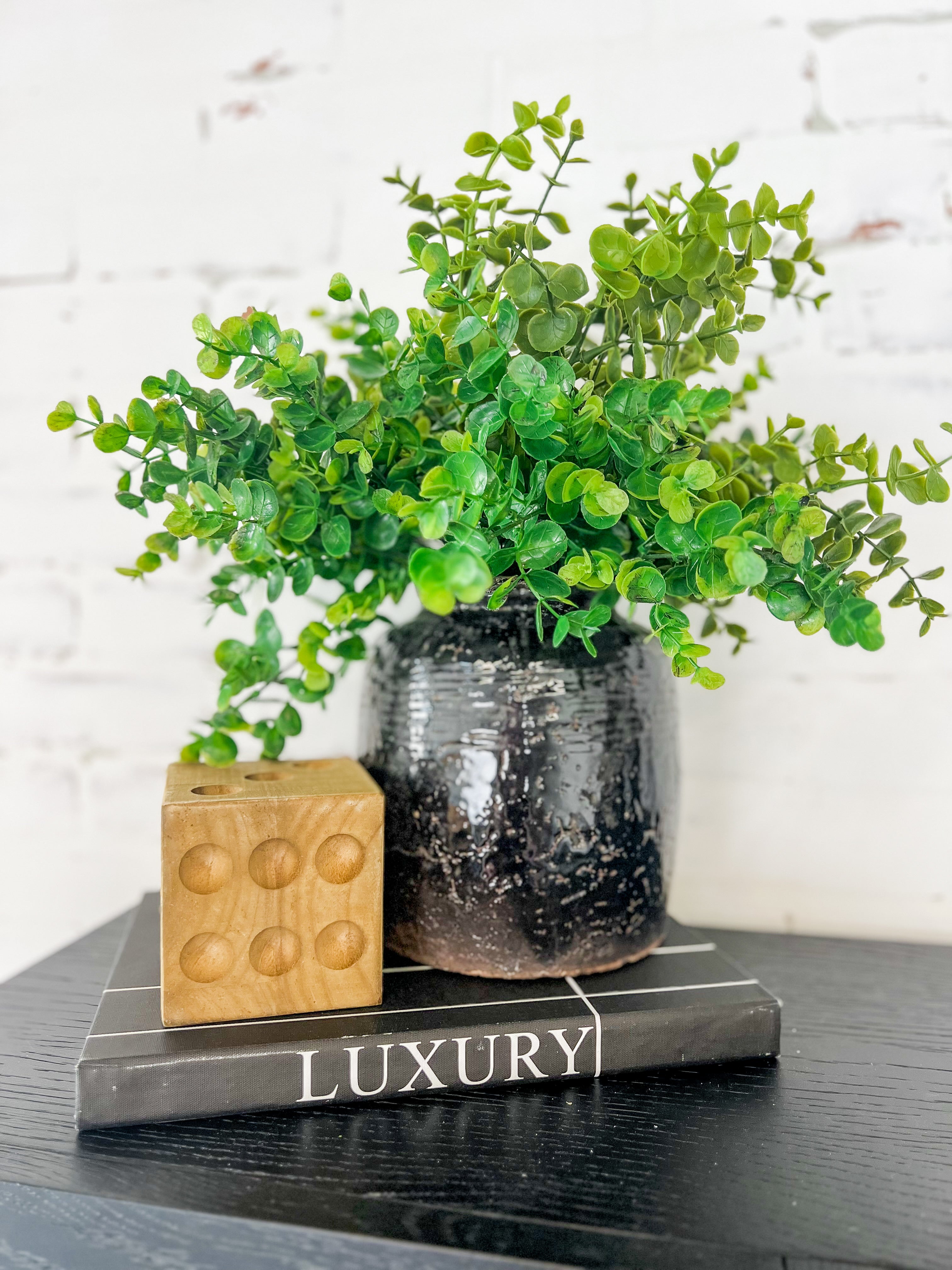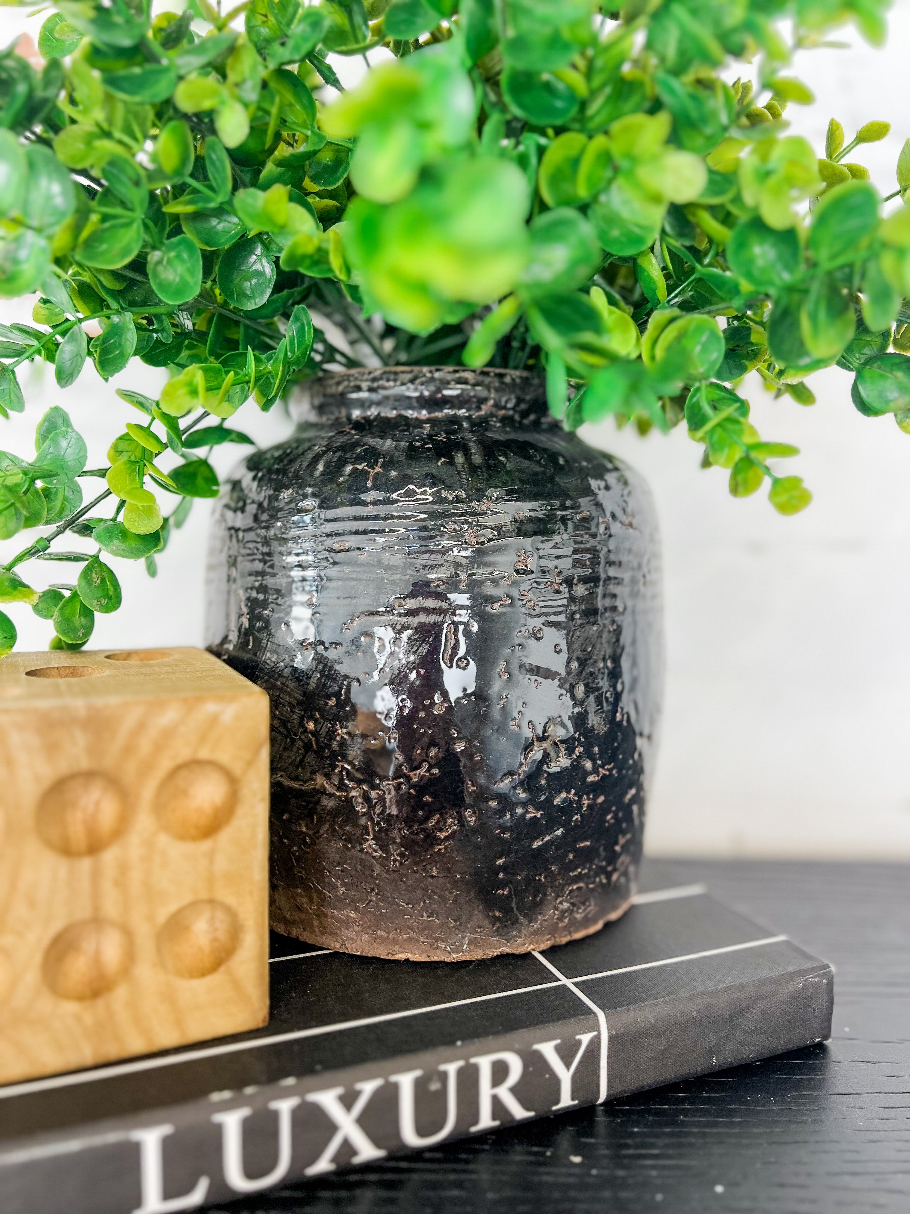 Organic texture meets low-maintenance style. This speckled black vase has a handmade look with rustic edges and eats to fill with lively faux greens.