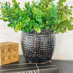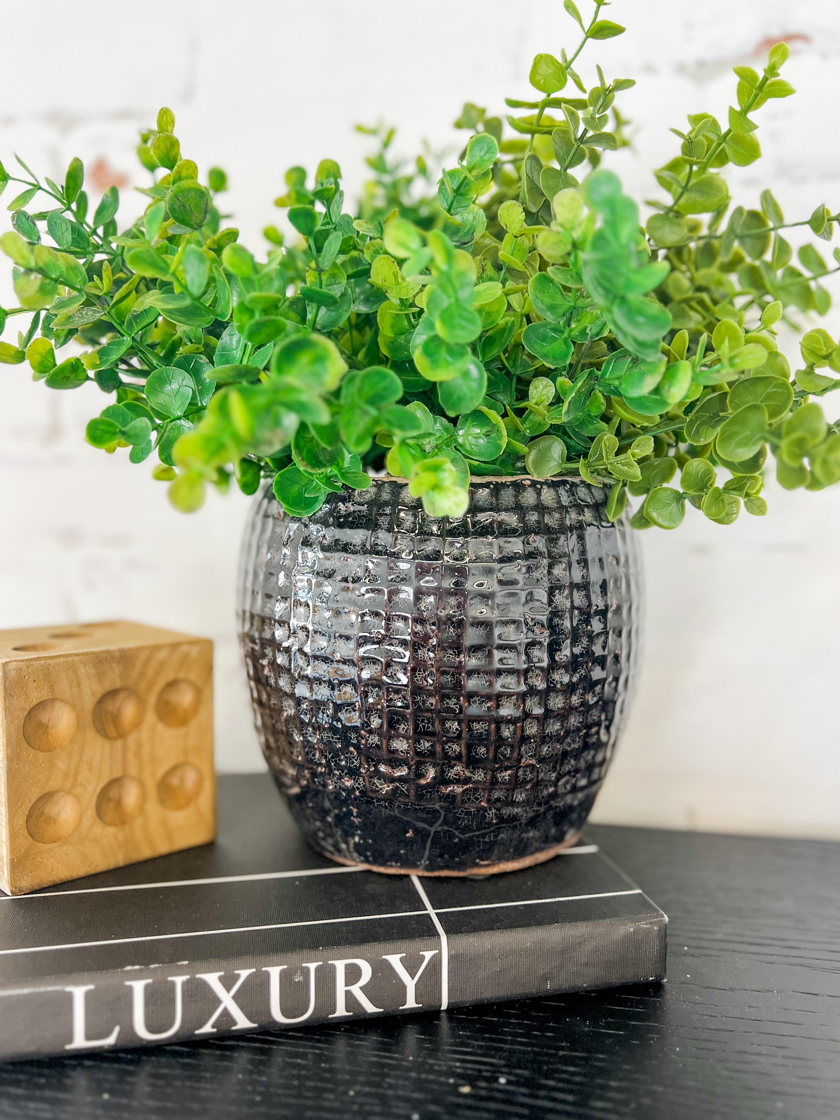 When cozy meets chic. This vase’s subtle grid texture and dark glazed finish add visual interest while the bright faux greenery pops with freshness. A win-win.