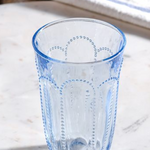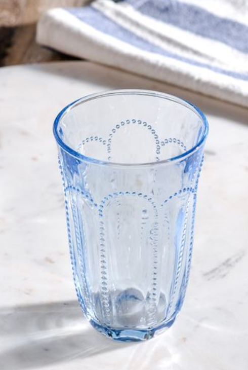 This blue embossed glass tumbler brings a light, airy feel to everyday drinkware. The subtle texture and soft blue hue add visual interest without feeling heavy, making it easy to mix into both casual and styled settings. It’s a great size for water, iced coffee, or a simple refreshment at the counter.