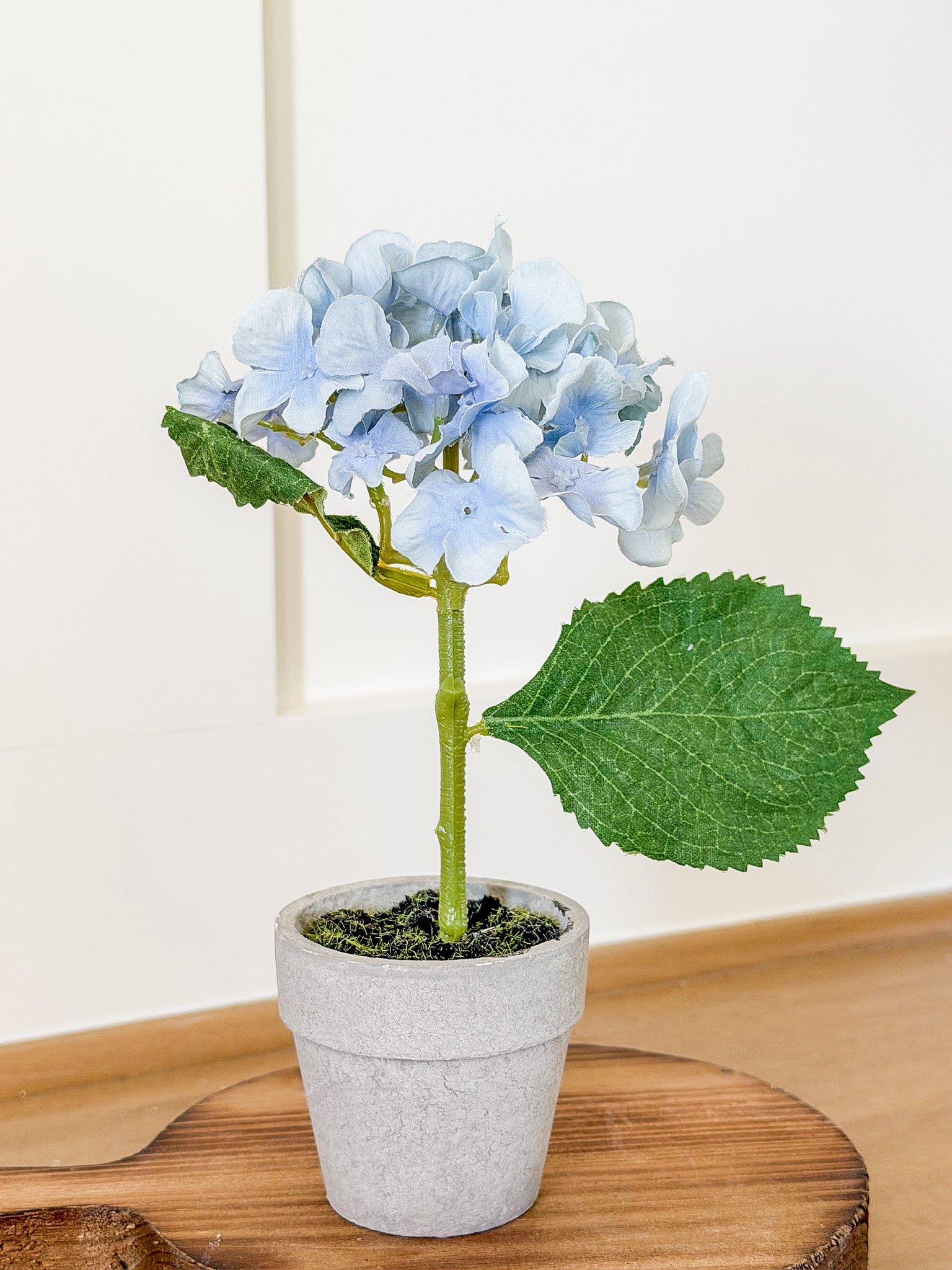 The Hydrangea Drop-In Pot – Blue features realistic petals and textured leaves set inside a classic gray pot. Style it in a kitchen nook, on a coffee table stack or alongside other greenery for a curated, pulled-together look in seconds.