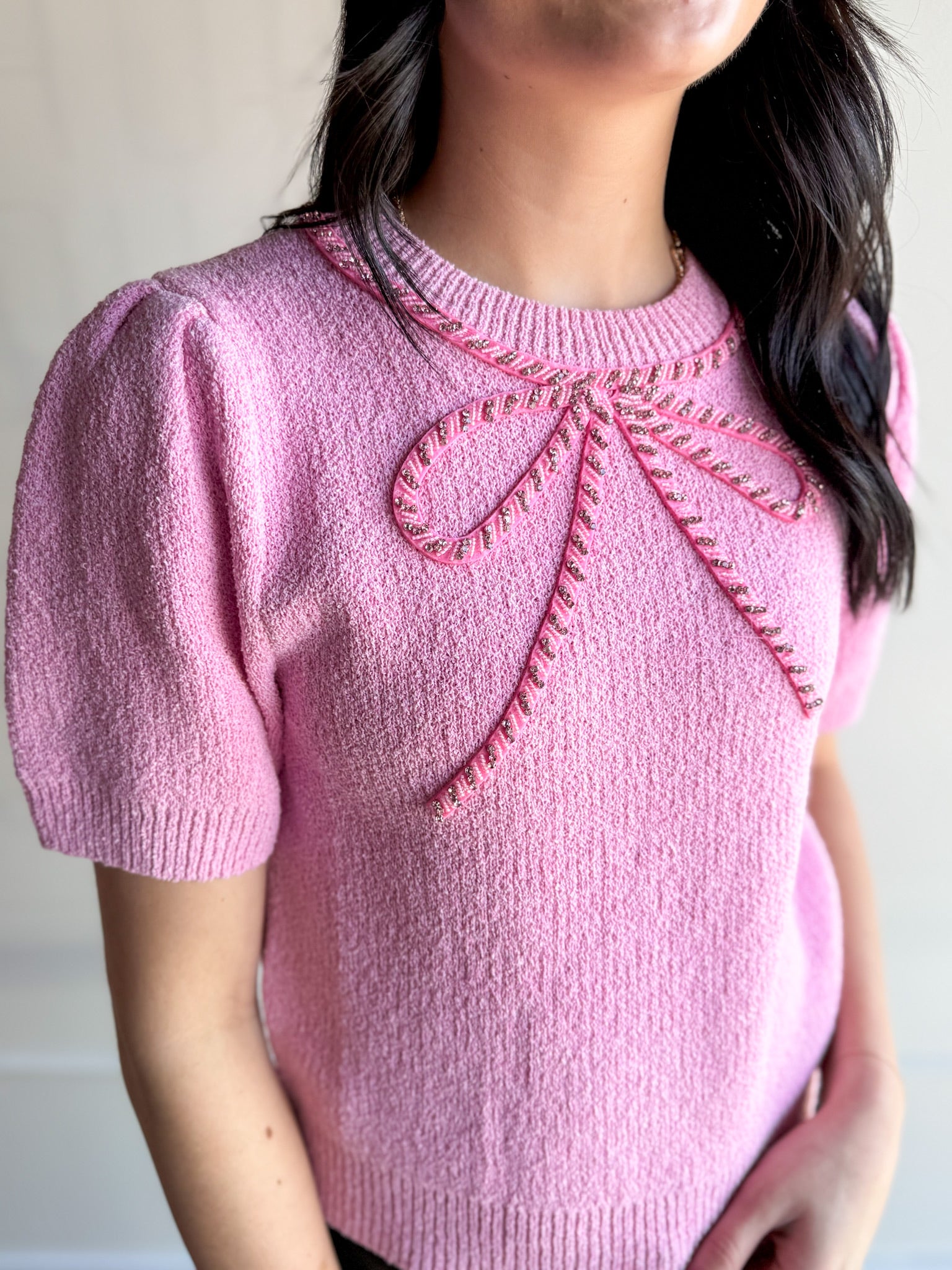 This blush knit top features an embroidered bow design accented with subtle beading that adds just the right amount of charm. The soft texture and puff sleeves give it a polished feel while still being easy to wear for everyday or dressed-up moments.