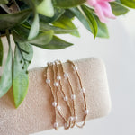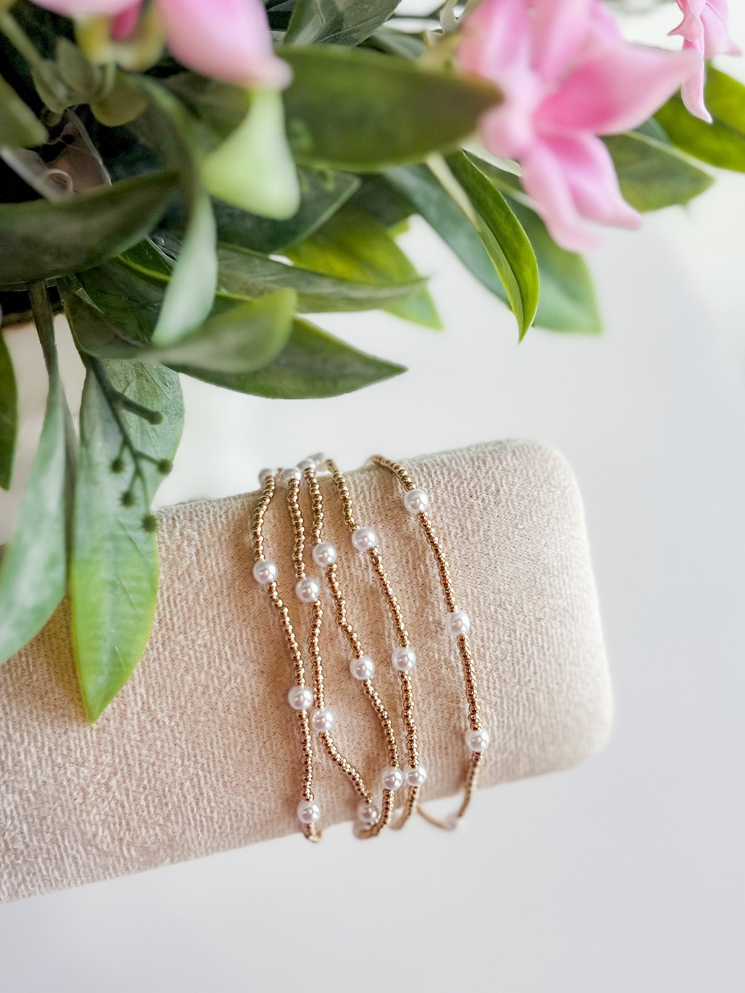 A set of stretch bracelets made with gold tone beads and spaced pearl accents. Designed to be worn together or mixed with other favorites for an easy, layered look on the wrist.