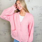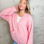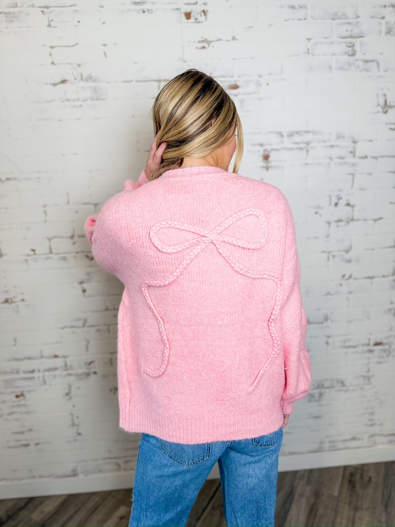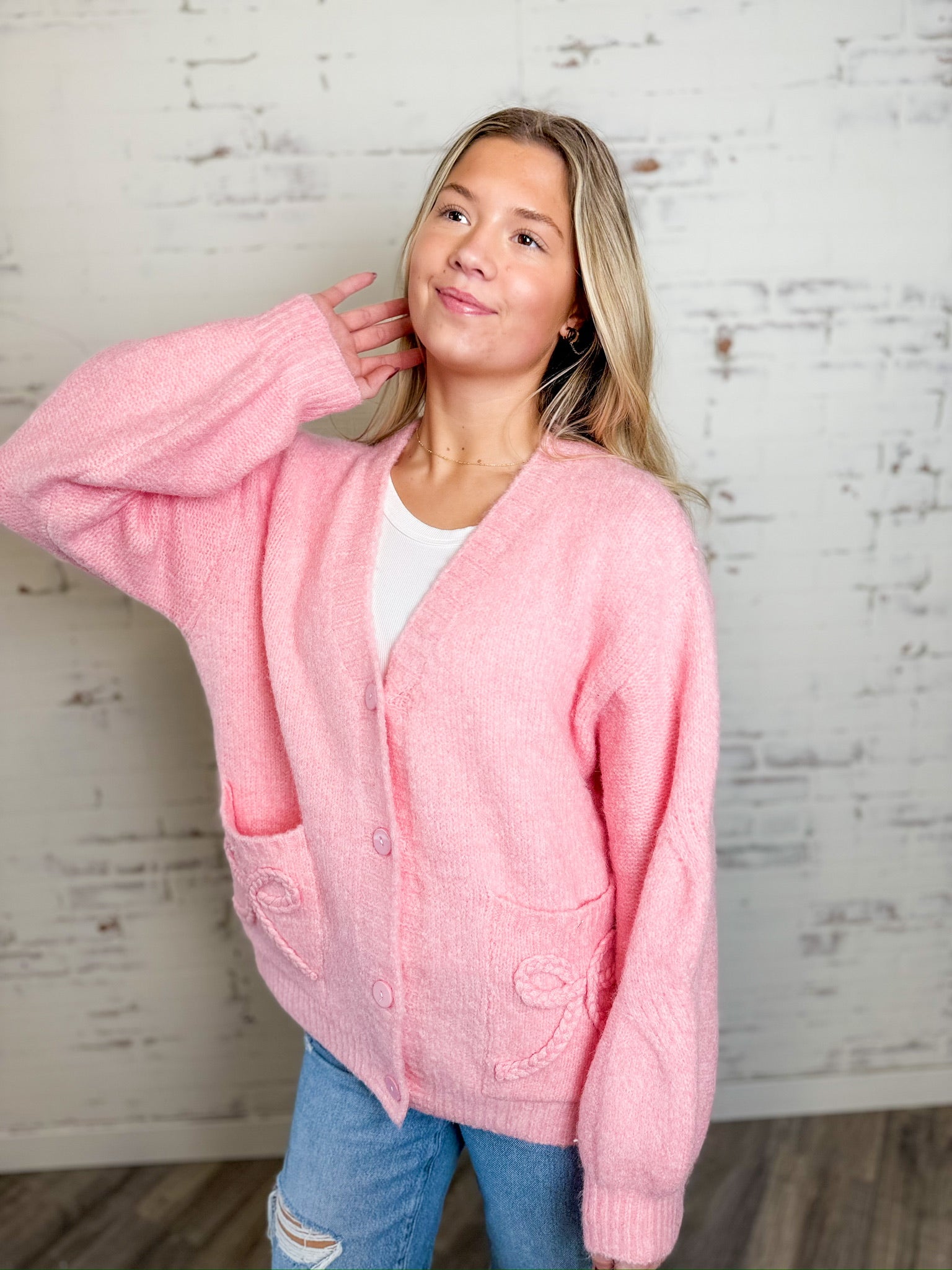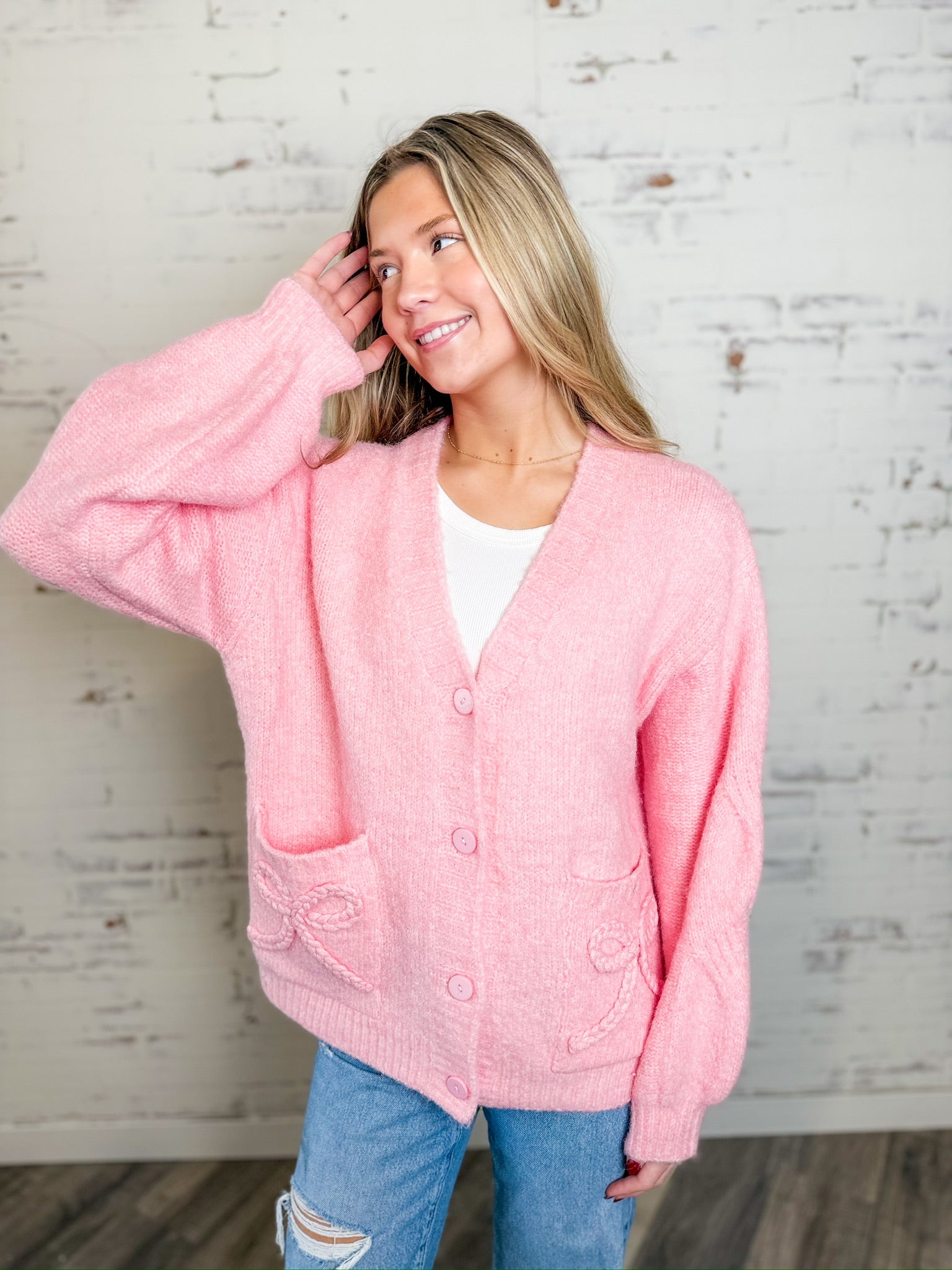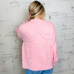 A cozy bubblegum pink cardigan with the sweetest bow details — front pockets and a statement bow on the back. Soft, sweet and perfect for layering over basics for an instant dose of charm.