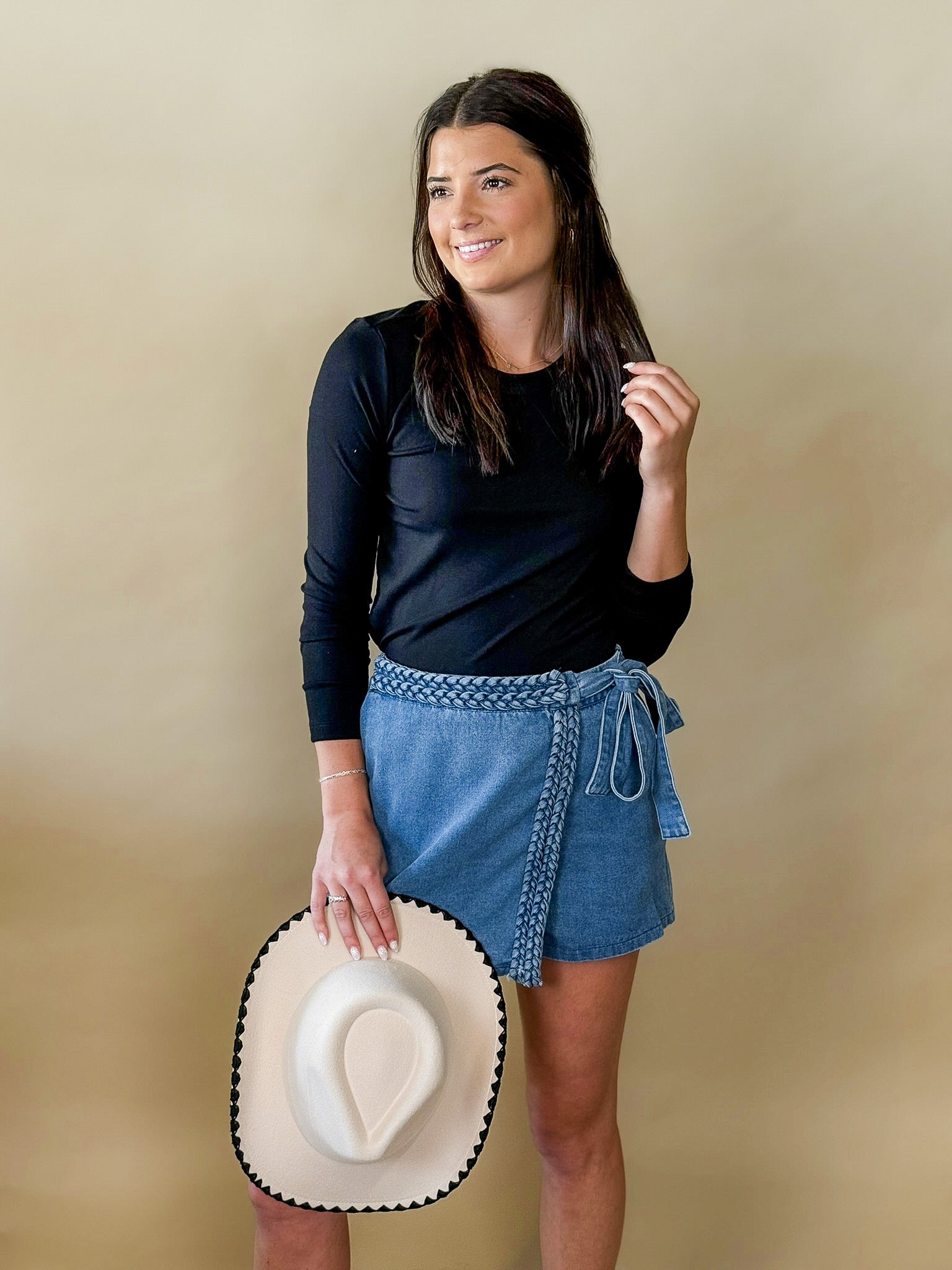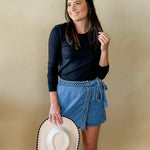 Skirt or shorts? Why not both. The Braided Bliss Denim Wrap Skort gives you the chic look of a wrap skirt with the comfort and confidence of shorts underneath. The braided denim tie detail adds a fun, elevated twist, making this piece an instant standout in your wardrobe.