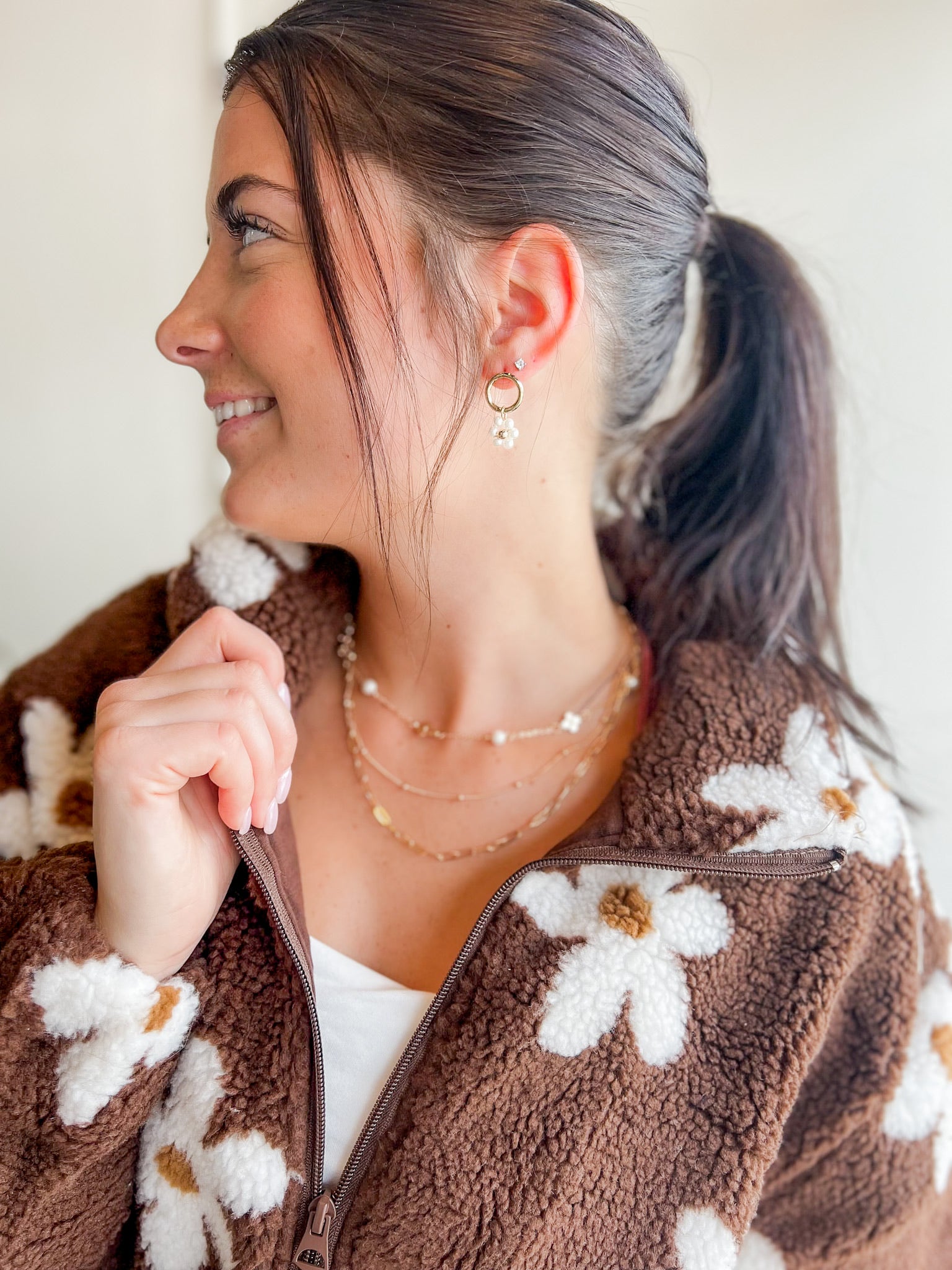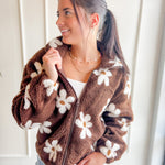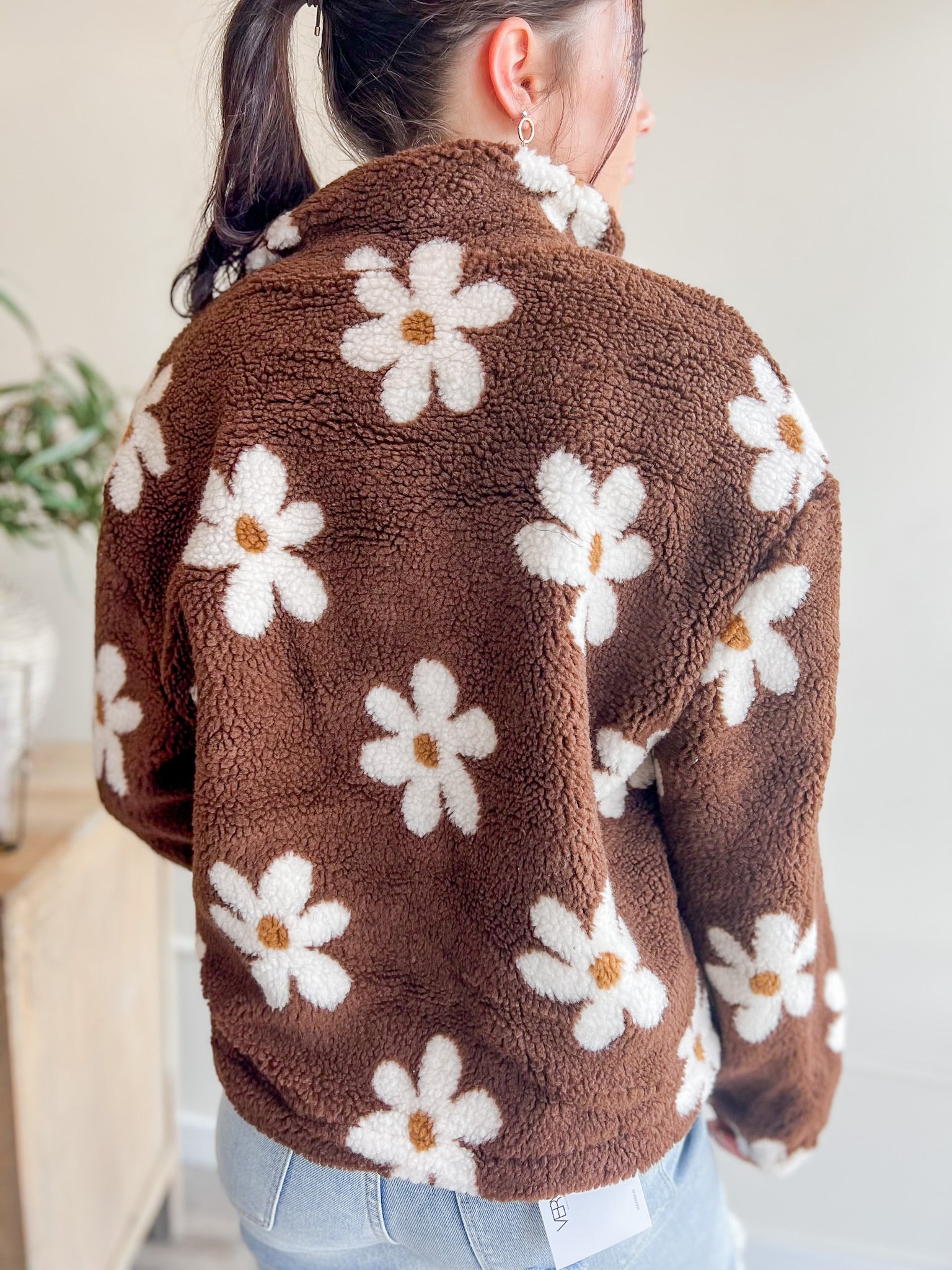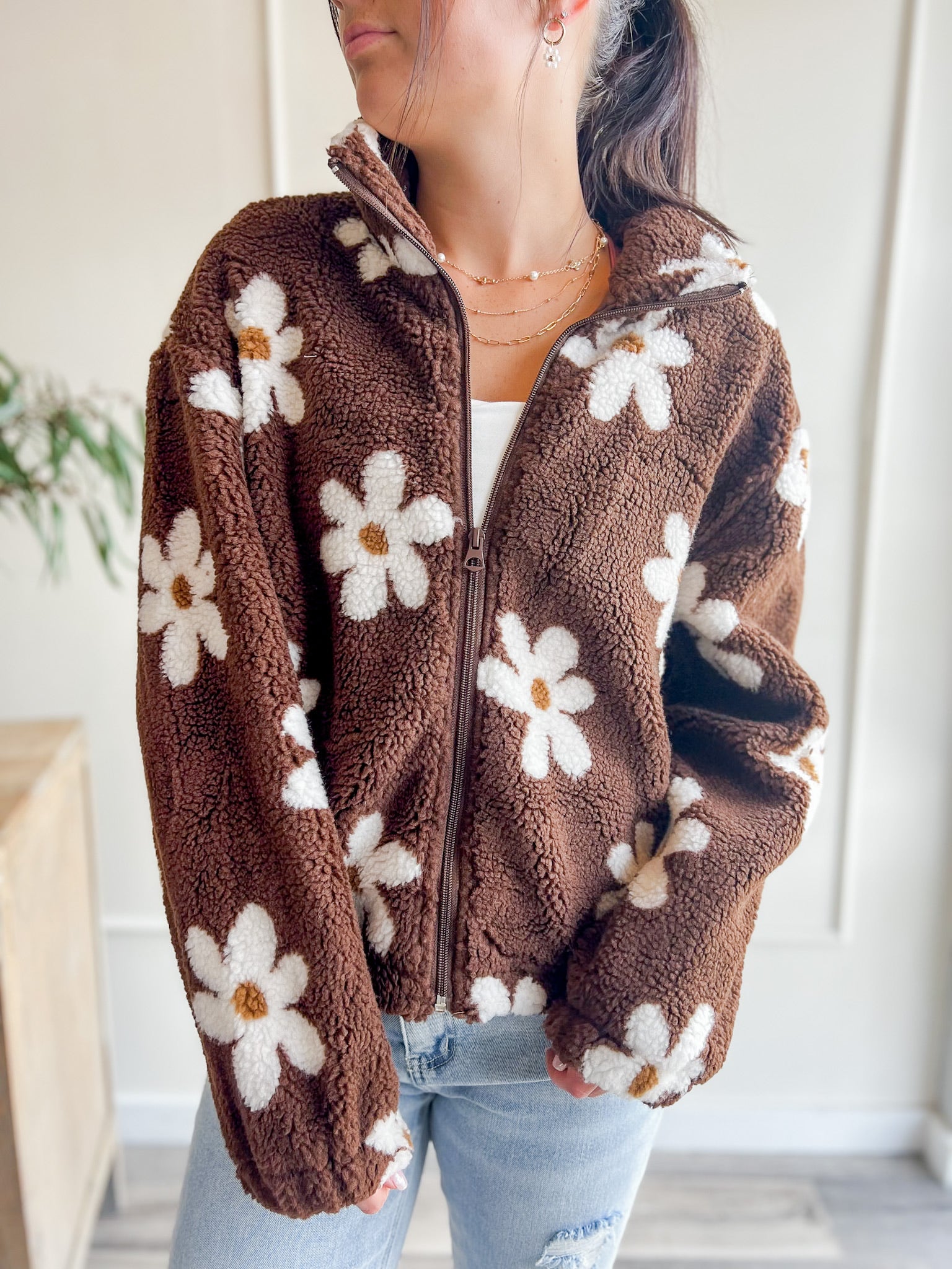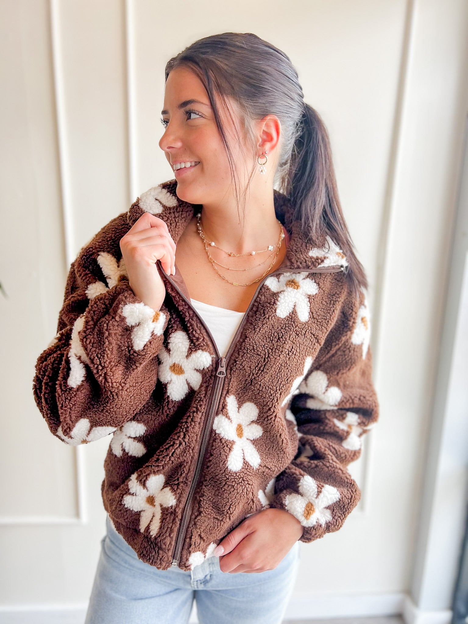 Flower power, but make it cozy. This brown sherpa zip-up is covered in playful white daisies that bring all the retro charm. Soft, snuggly, and perfectly oversized, it’s your new go-to for chilly mornings and coffee runs. Chloe is 5’7” and wearing a size small.