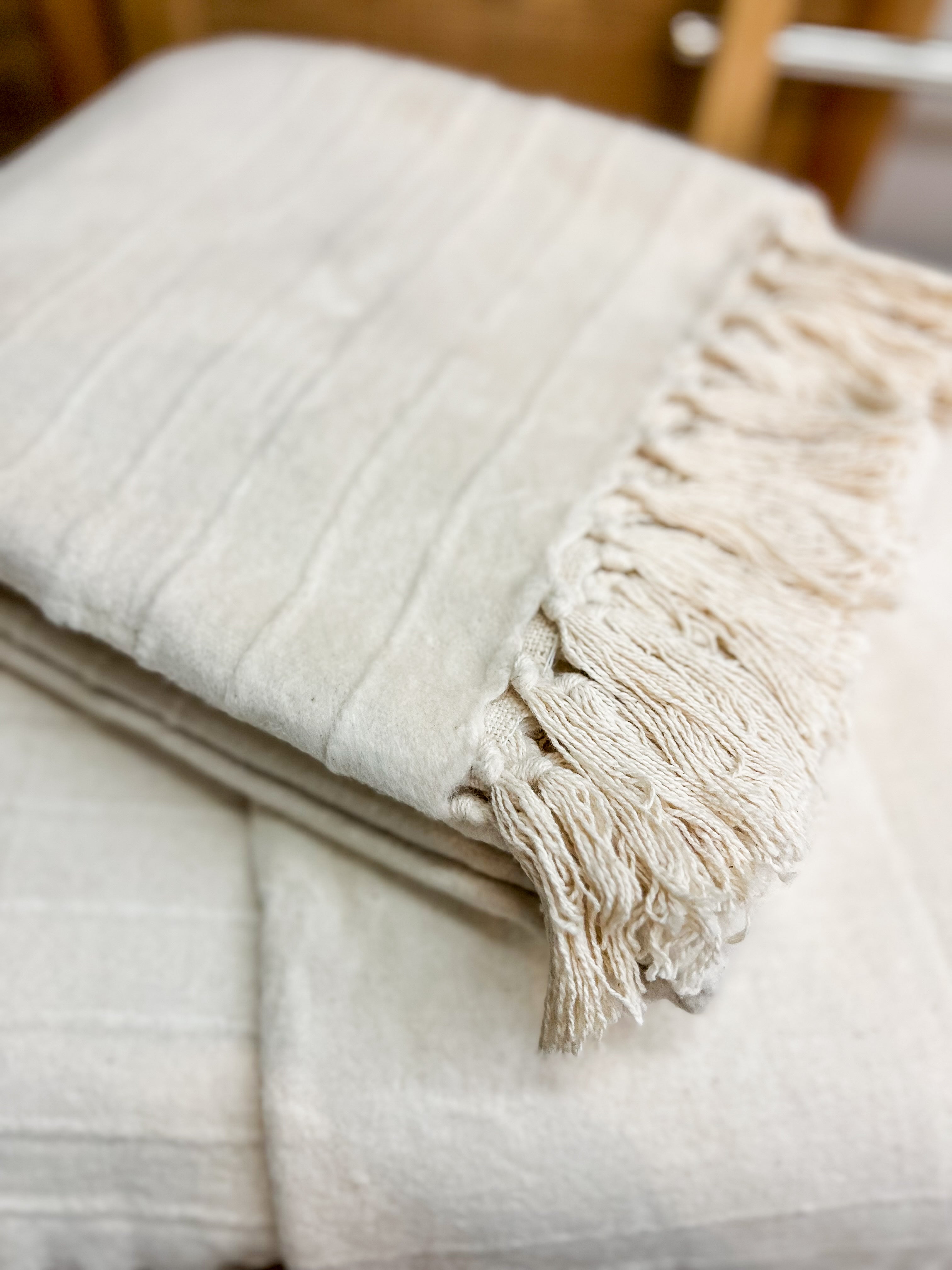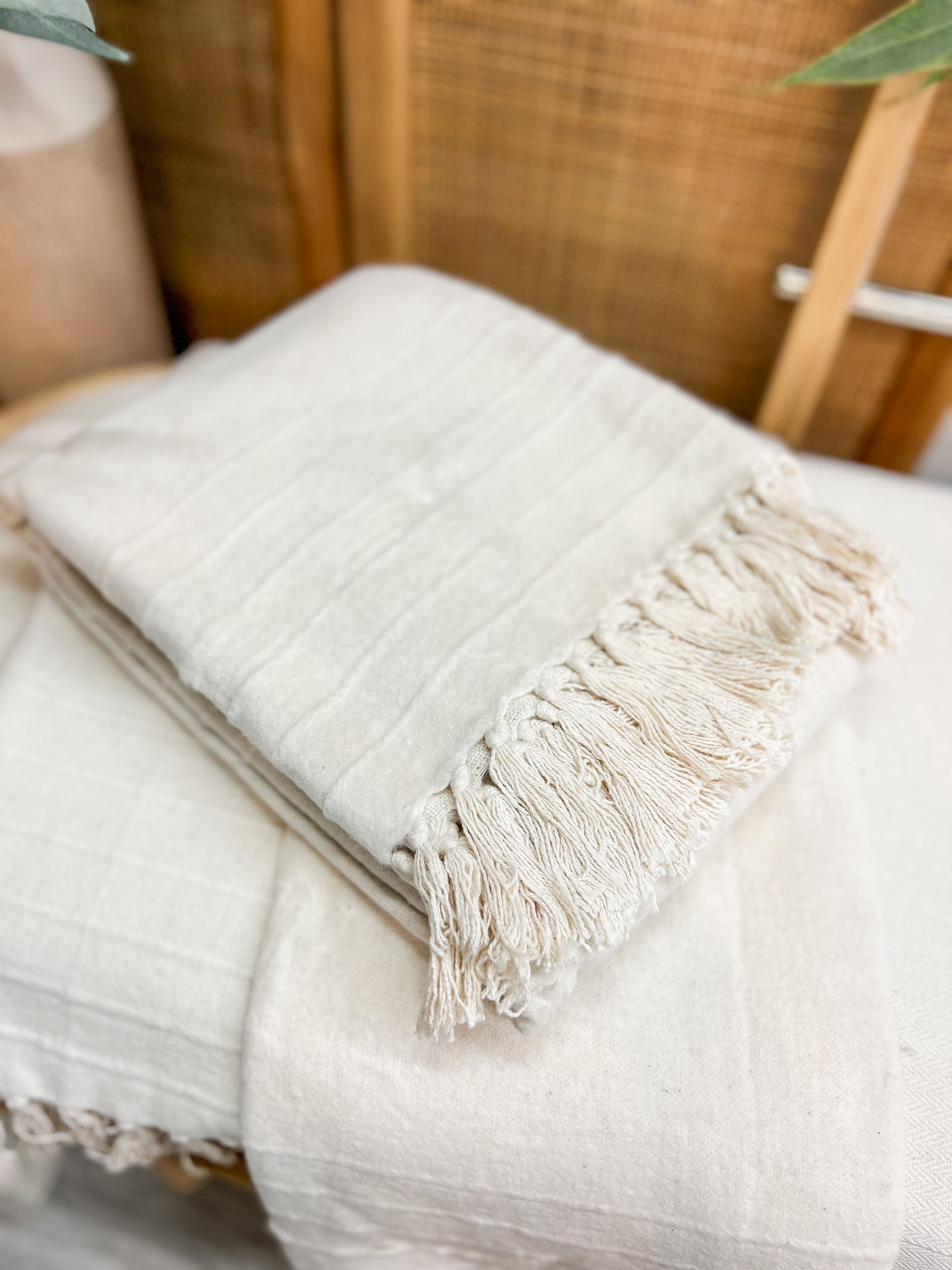 Cuddle up in style with this brushed cotton fringe throw. Its neutral beige color is accented with subtle striped lines throughout. It's a great addition to an entryway bench, the end of the bed or a featured blanket ladder.