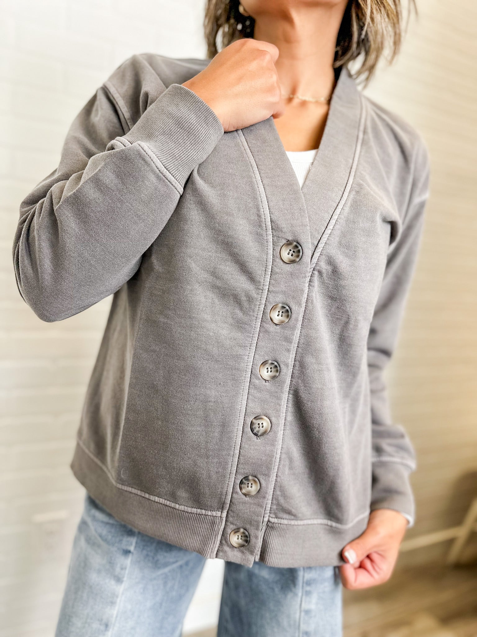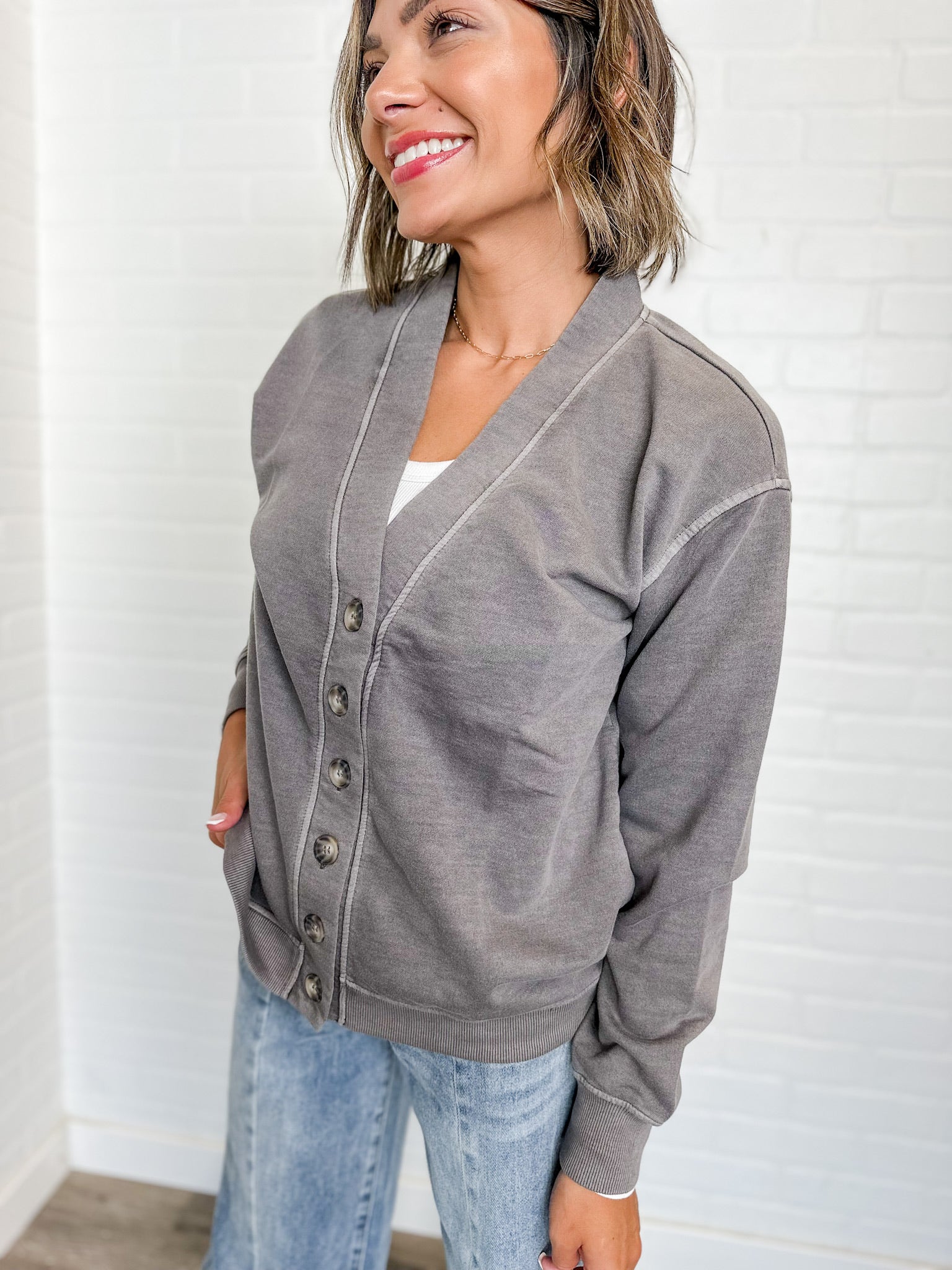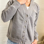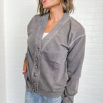 Laid-back layers done right. This soft gray button-up cardigan is the perfect mix of comfy and cool — easy to throw over tees, tanks, or dresses. With ribbed trim and a relaxed fit, it’s an everyday staple that never goes out of style. Rachel is 5’2” and wearing a size small.