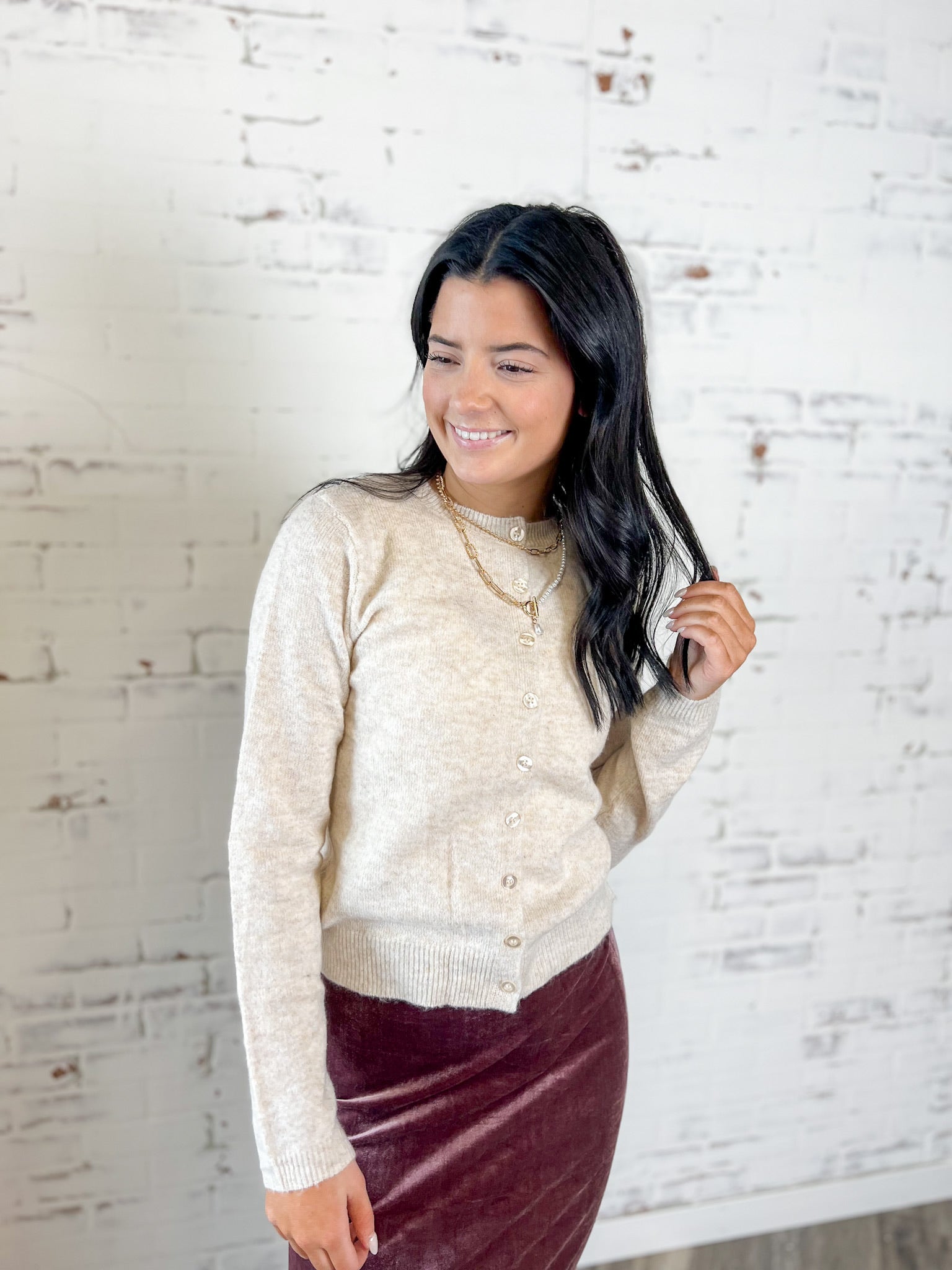 The Polished & Cozy Button Cardigan features a flattering, true-to-size fit with just enough stretch to keep it comfortable all day. It’s refined without feeling stuffy — perfect for workdays, church or everyday wear when you want to look pulled together with minimal effort.