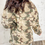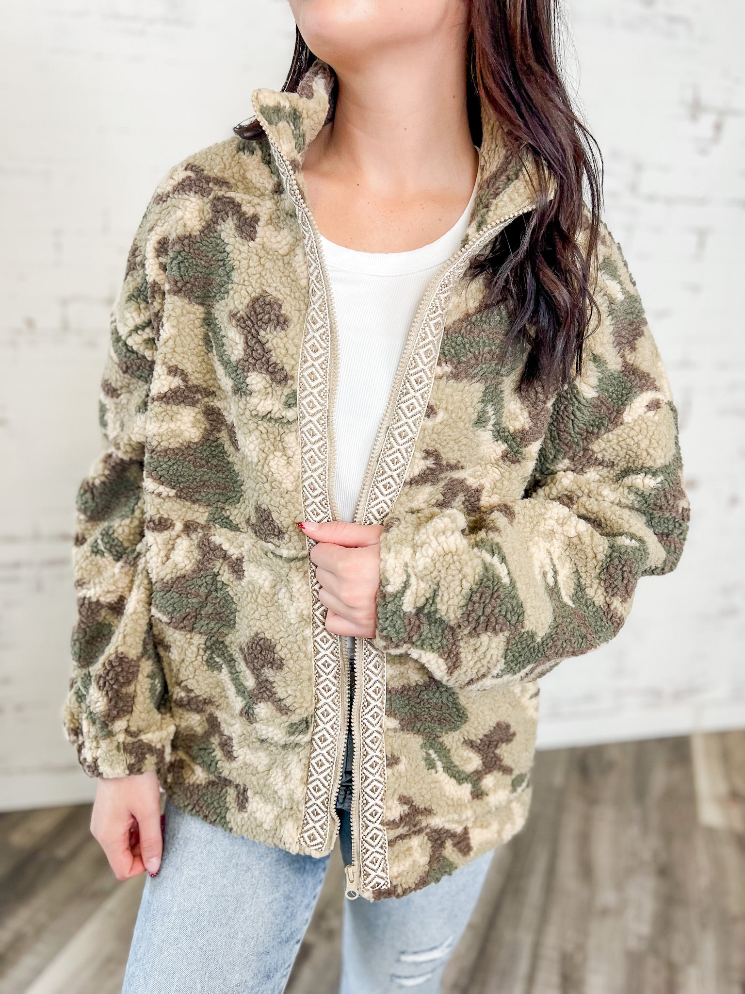 Cozy meets cool. This camo-print sherpa jacket brings all the warm, snuggle-worthy vibes with a fun textured twist. Trimmed with a patterned zipper detail and finished with roomy pockets, it’s the perfect throw-on layer for busy days and chilly nights. Chloe is 5’7” and wearing a size small.