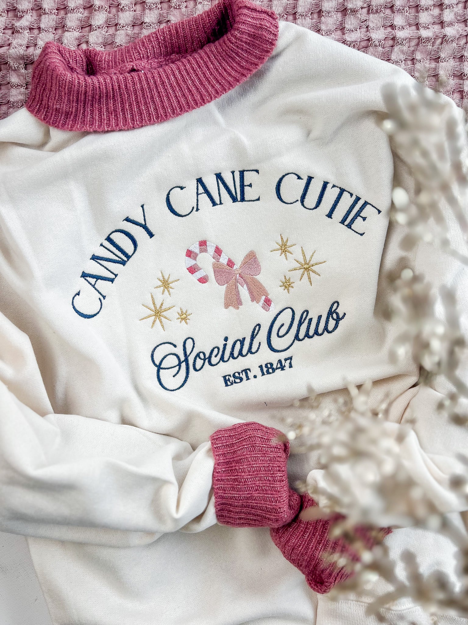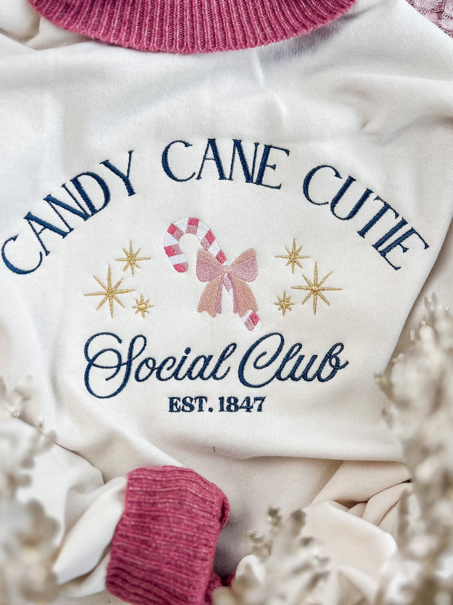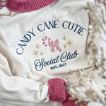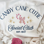 Sweet, festive, and oh-so-cozy! Our Candy Cane Cutie Social Club crewneck brings a playful twist to your holiday wardrobe with its charming candy cane embroidery, twinkling gold stars, and vintage-inspired lettering. Soft, warm, and full of Christmas cheer—this one’s made for cookie swaps, cocoa runs, and cozy movie nights.