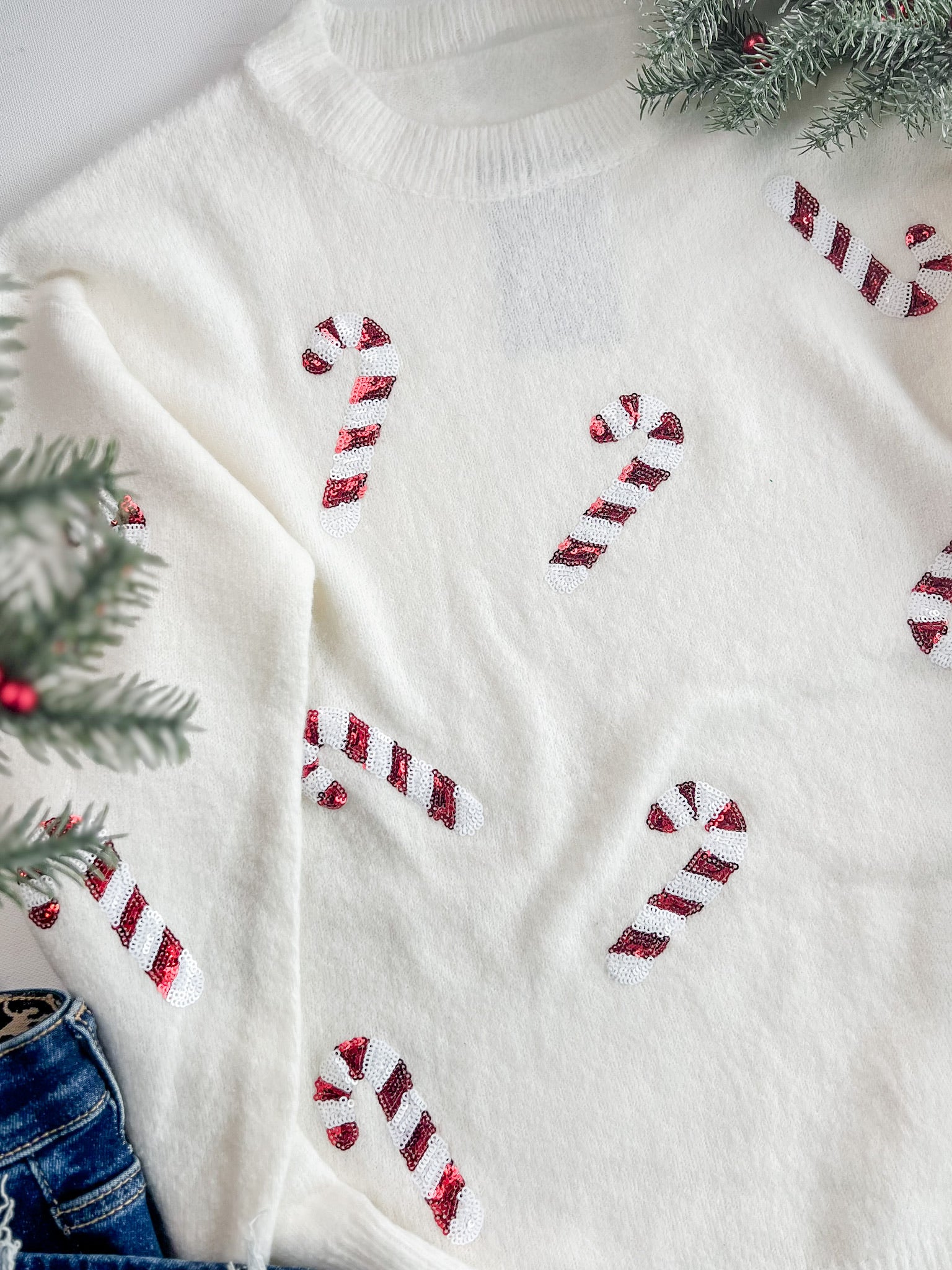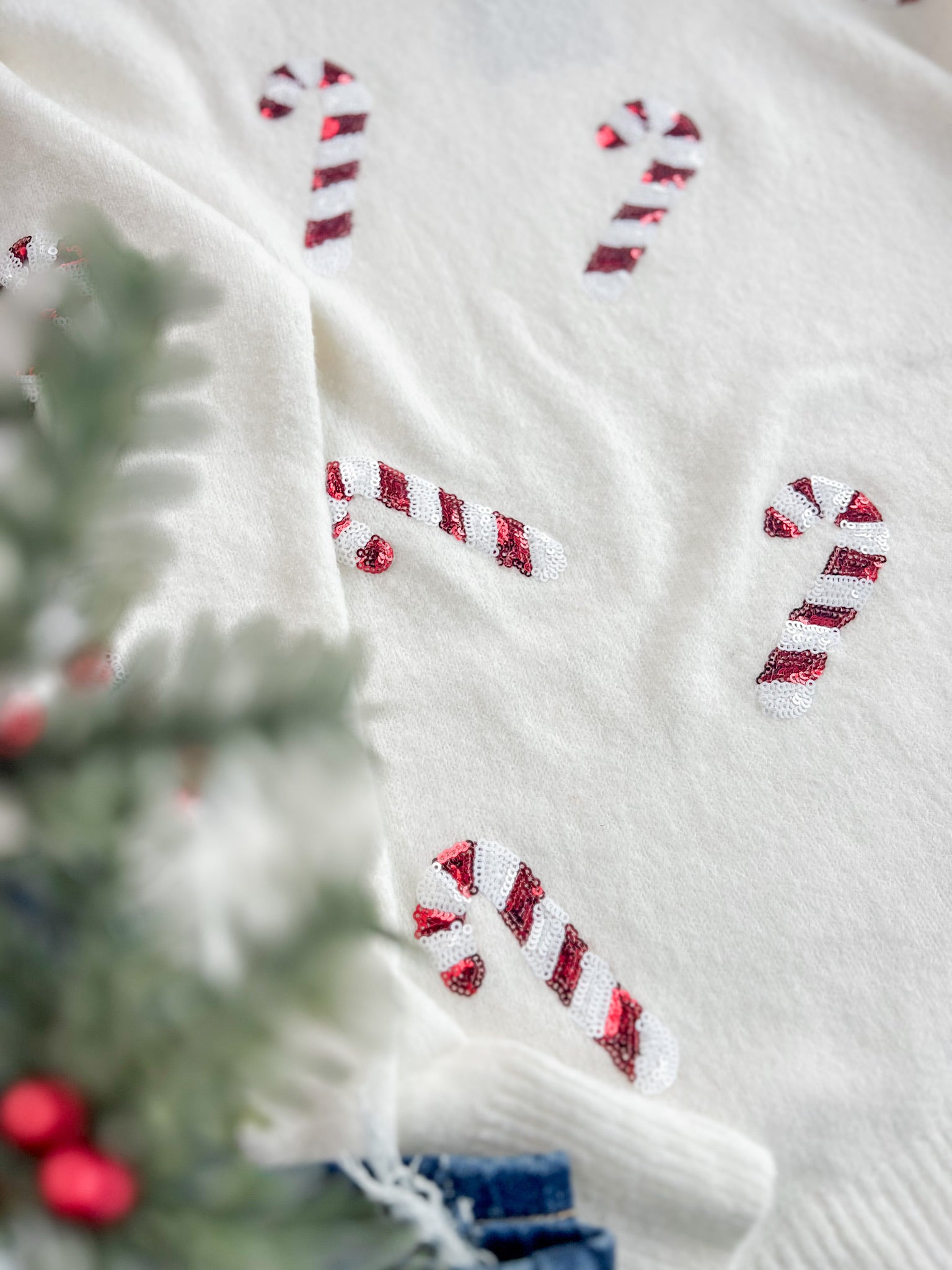 Sweet and sparkly, just like the season. This cozy white knit sweater is decked out with red and white sequin candy canes for a fun and festive finish that shines all winter long.