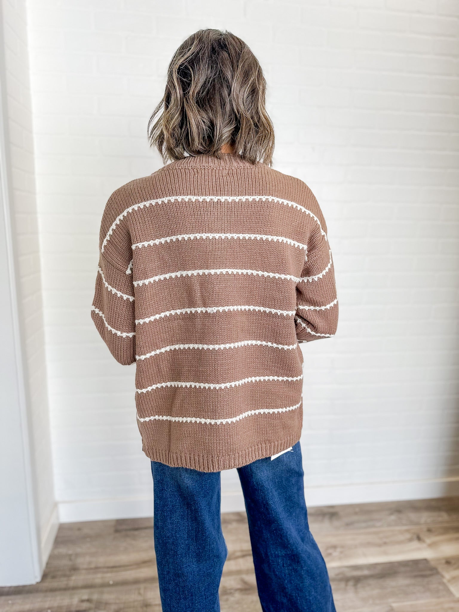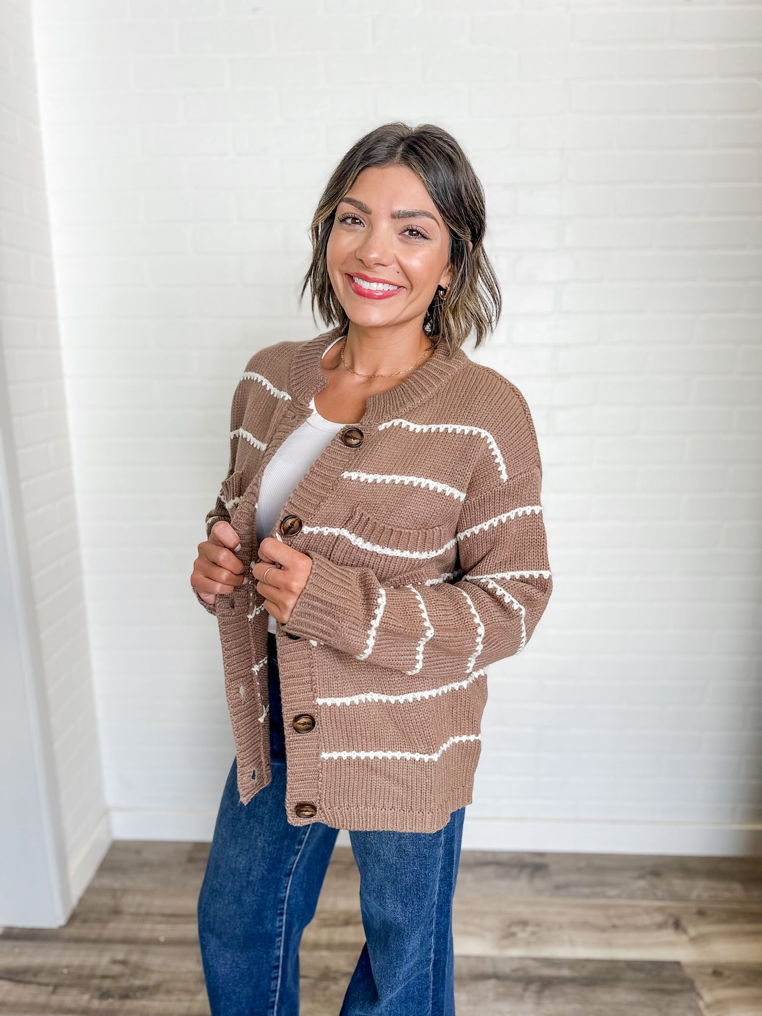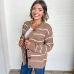 Comfy, classic, and made for layering. This mocha striped cardigan brings cozy fall charm with its chunky knit texture and tortoise button details. Throw it over a basic tee or turtleneck for an easy, pulled-together look. Rachel is 5’2” and wearing a size small.