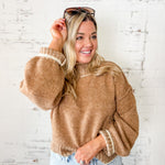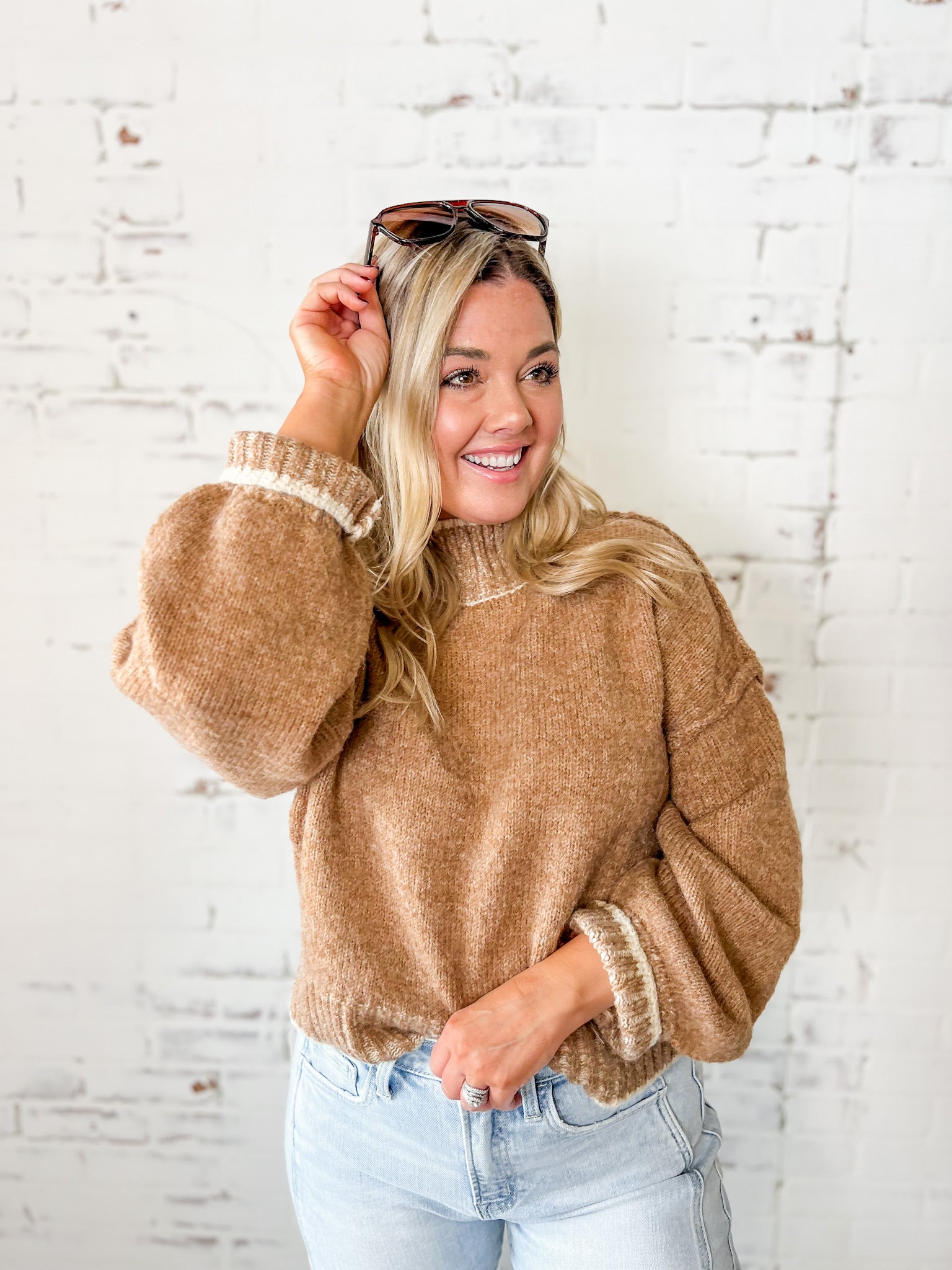 The definition of fall comfort. This soft knit sweater has an easy relaxed fit, contrast trim, and balloon sleeves for a touch of drama. Pair it with denim and booties for pumpkin patch season or cozy up at home with leggings.