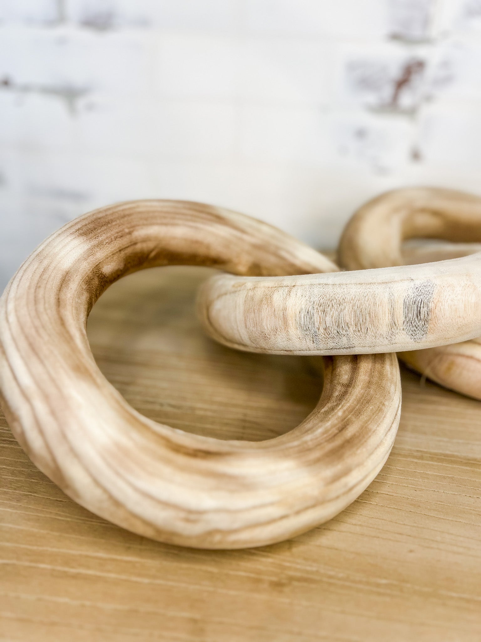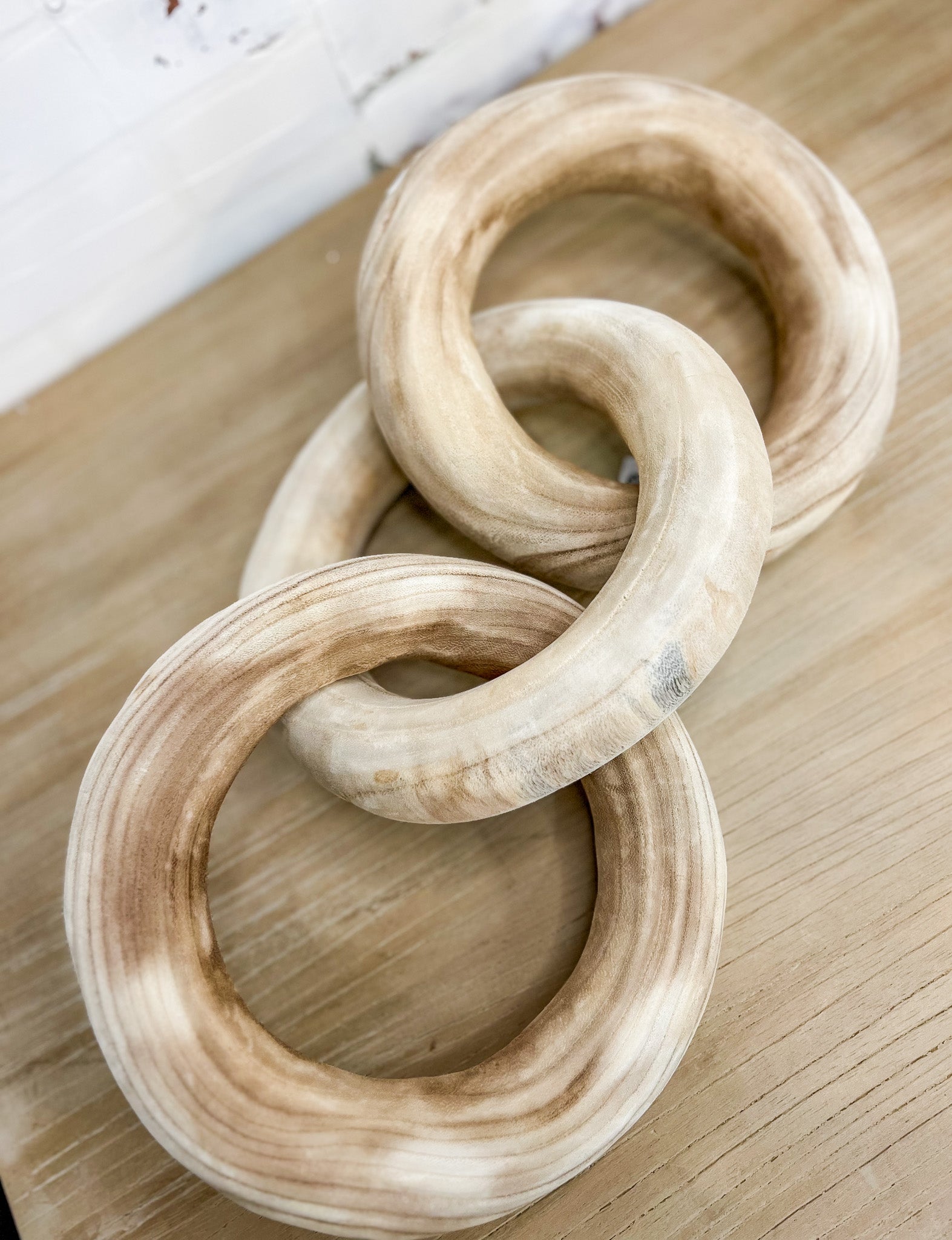 Add a touch of coziness to your home decor with our Round Link Decor. This unique piece can be used in a statement bowl or stacked with your favorite books. The natural wood grain color adds a touch of warmth to any space, making it a versatile addition to modern farmhouse or contemporary styles.