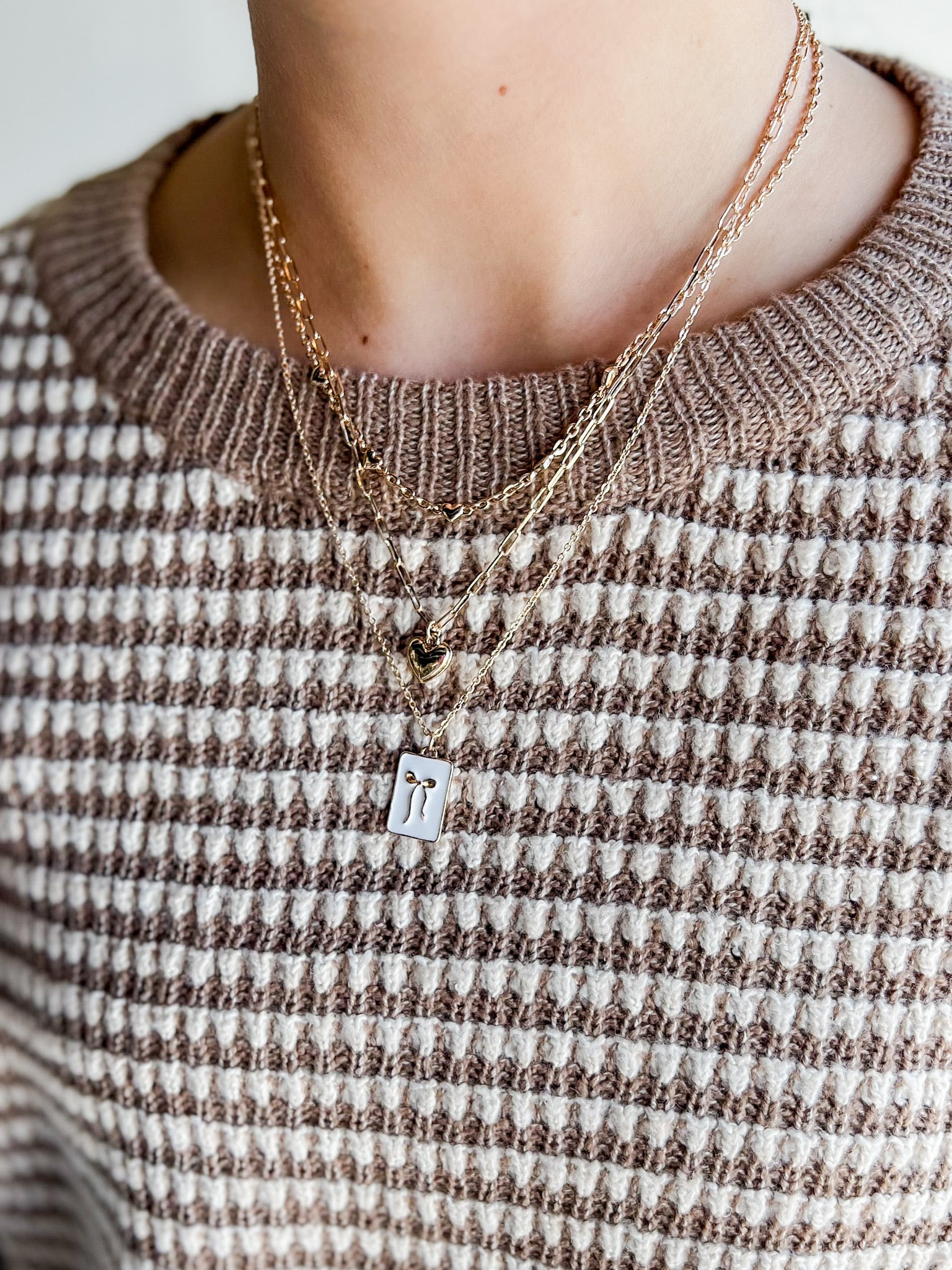 This layered gold necklace brings all the dainty, feminine vibes with a heart charm and an enamel bow pendant that instantly elevate any sweater or tee. The triple-layered look gives you that effortless stacked style without needing to mix and match pieces yourself. We've paired it with a textured neutral sweater to show how easily it fits into everyday outfits or holiday looks.