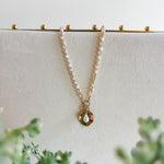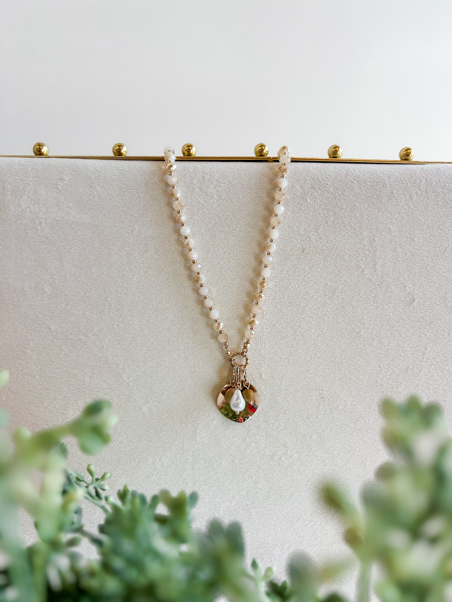 A beaded necklace featuring soft neutral beads and a small pearl drop charm layered over a flat gold tone disc. Delicate and balanced, this piece adds subtle texture and a finished look without feeling heavy.