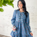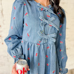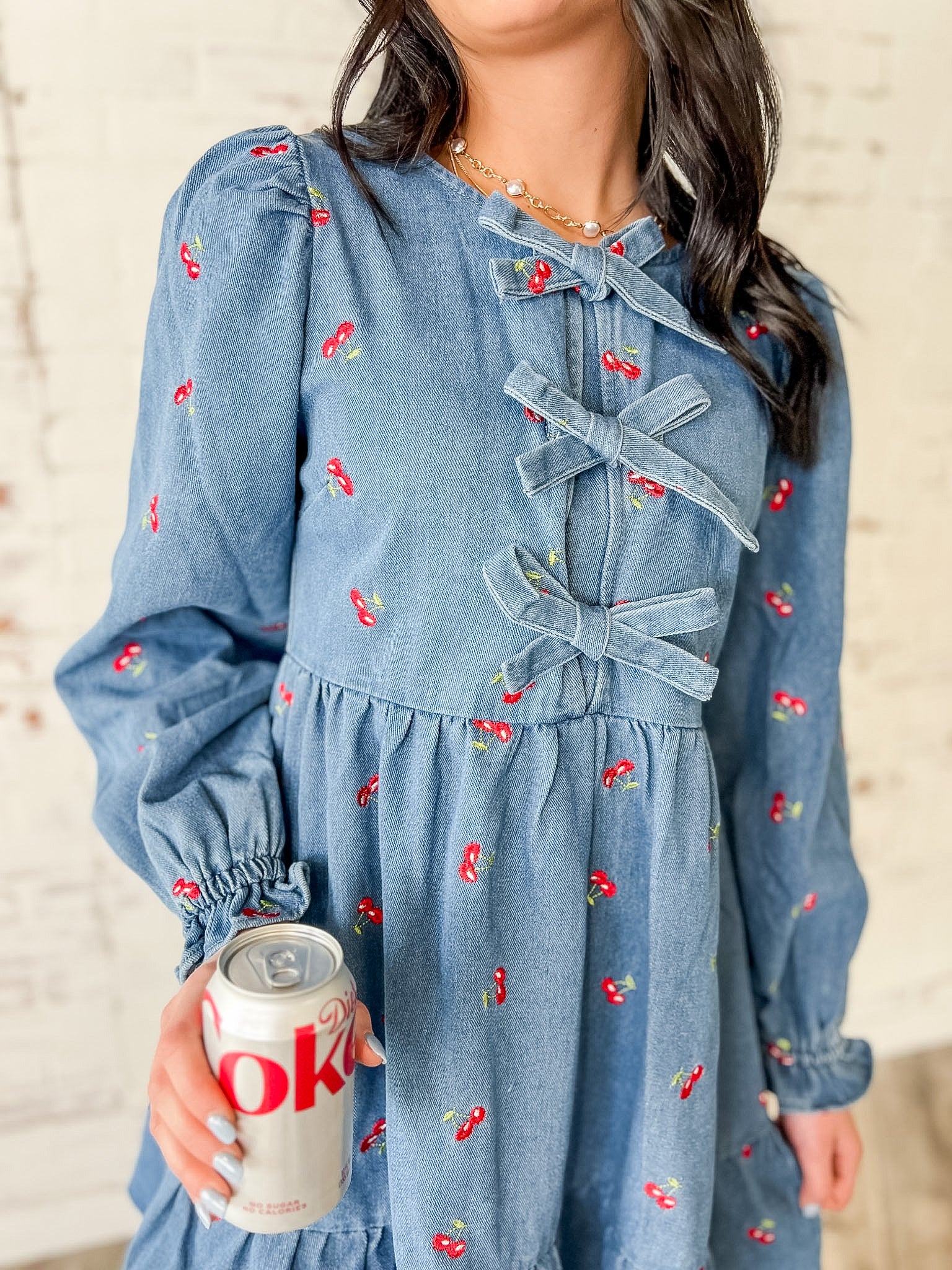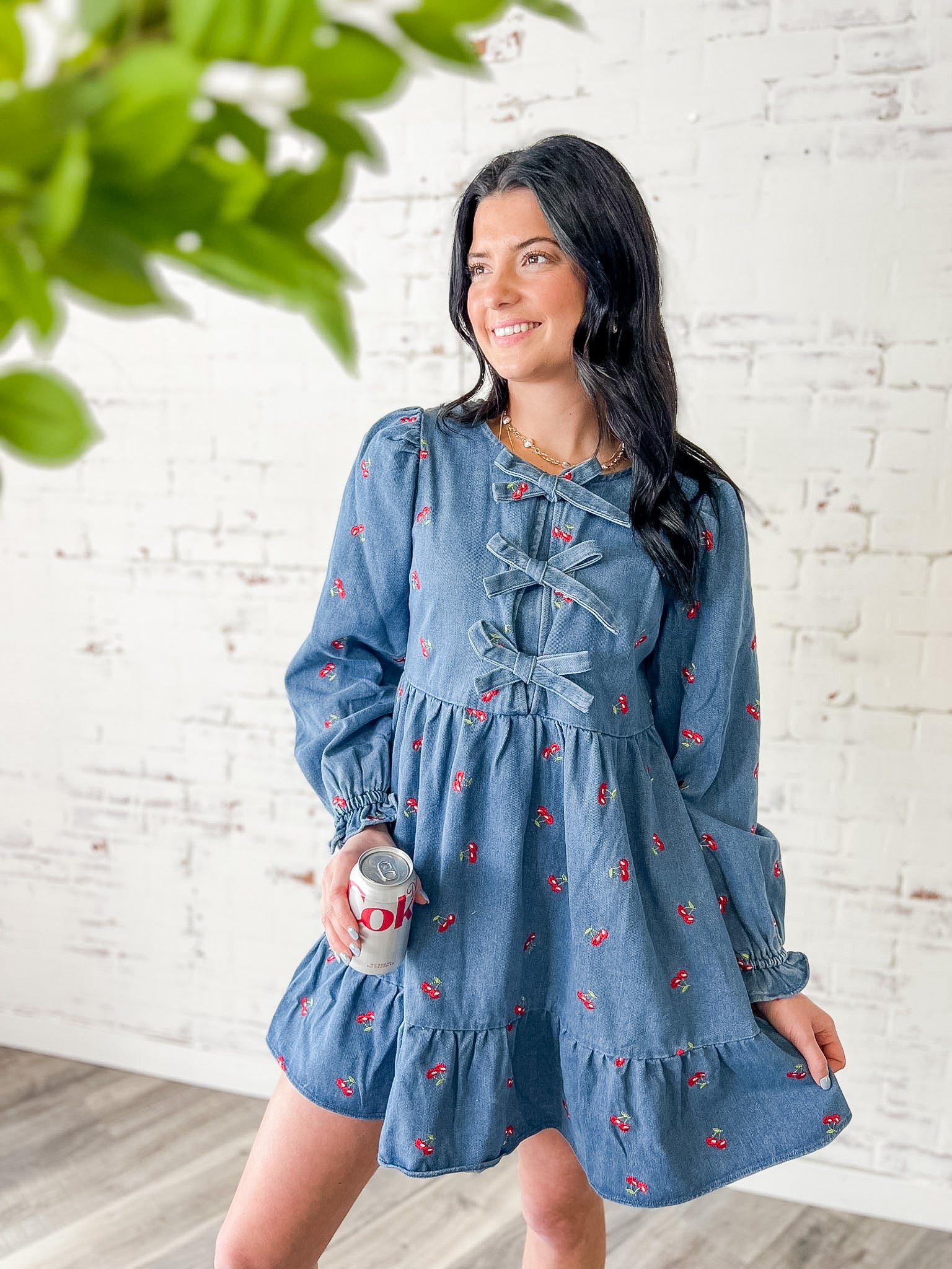 This dress is pure fun with the sweetest vintage-inspired charm. The soft denim fabric is scattered with tiny embroidered cherries that instantly give it personality, while the three bow ties down the front add the cutest feminine detail. The relaxed babydoll fit and tiered skirt make it easy to wear and comfortable while still feeling styled and playful.