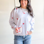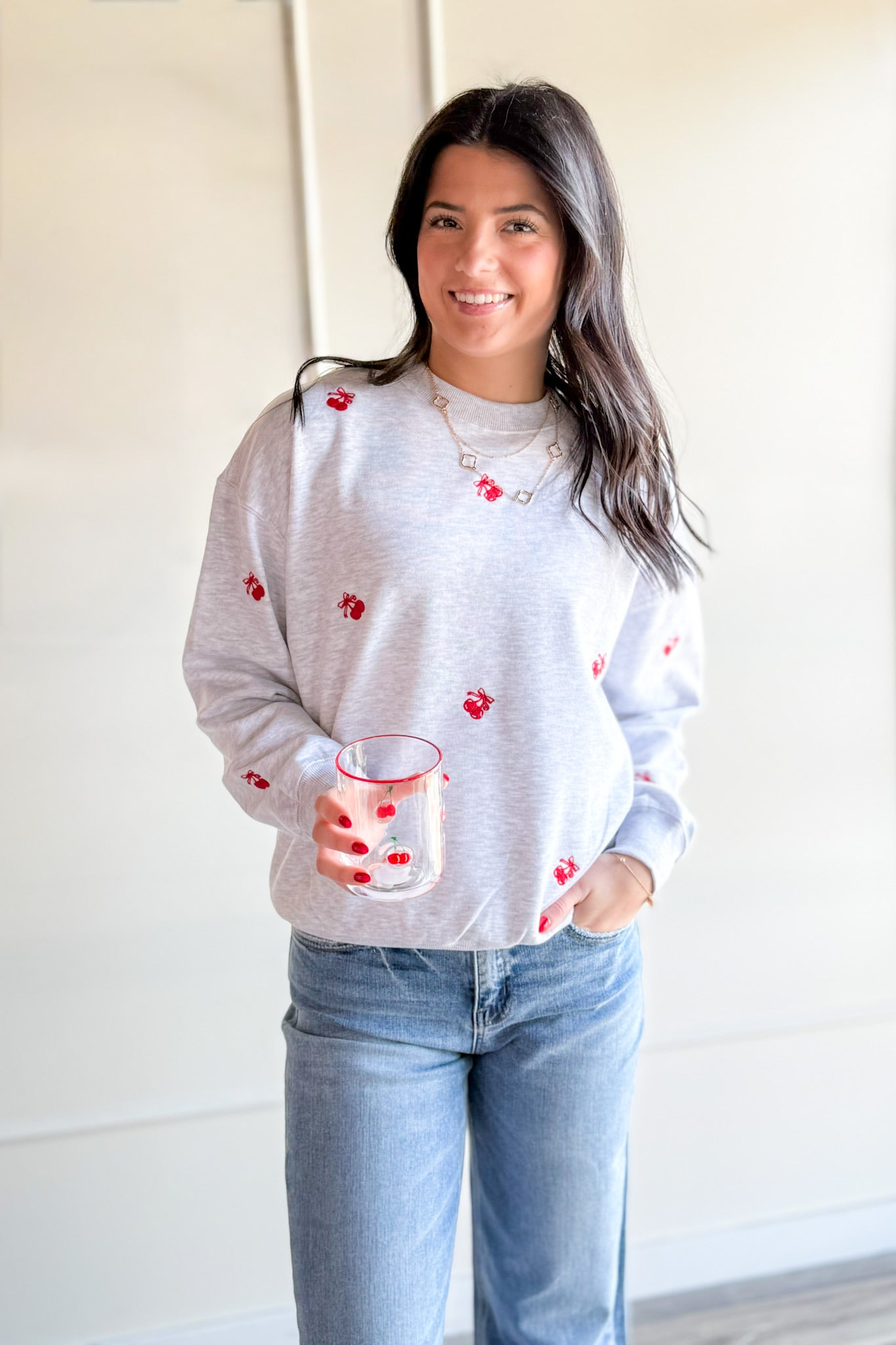 This light gray crewneck sweatshirt features embroidered cherry accents sprinkled throughout for a subtle, playful touch. Soft and comfortable with an easy everyday fit, it’s the kind of sweatshirt that feels fun but still totally wearable.