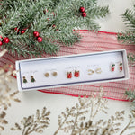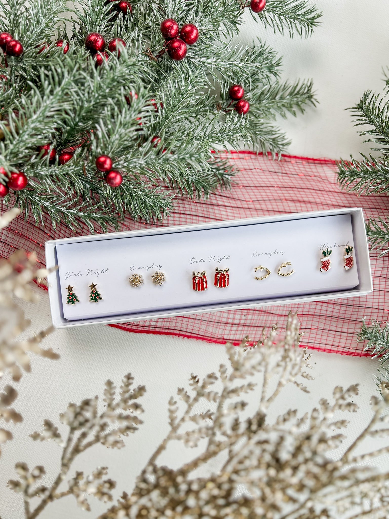 The season of sparkle is here! This five-pair earring set is filled with holiday charm — think Christmas trees, stockings, and shimmering gold studs to match every outfit on your calendar.