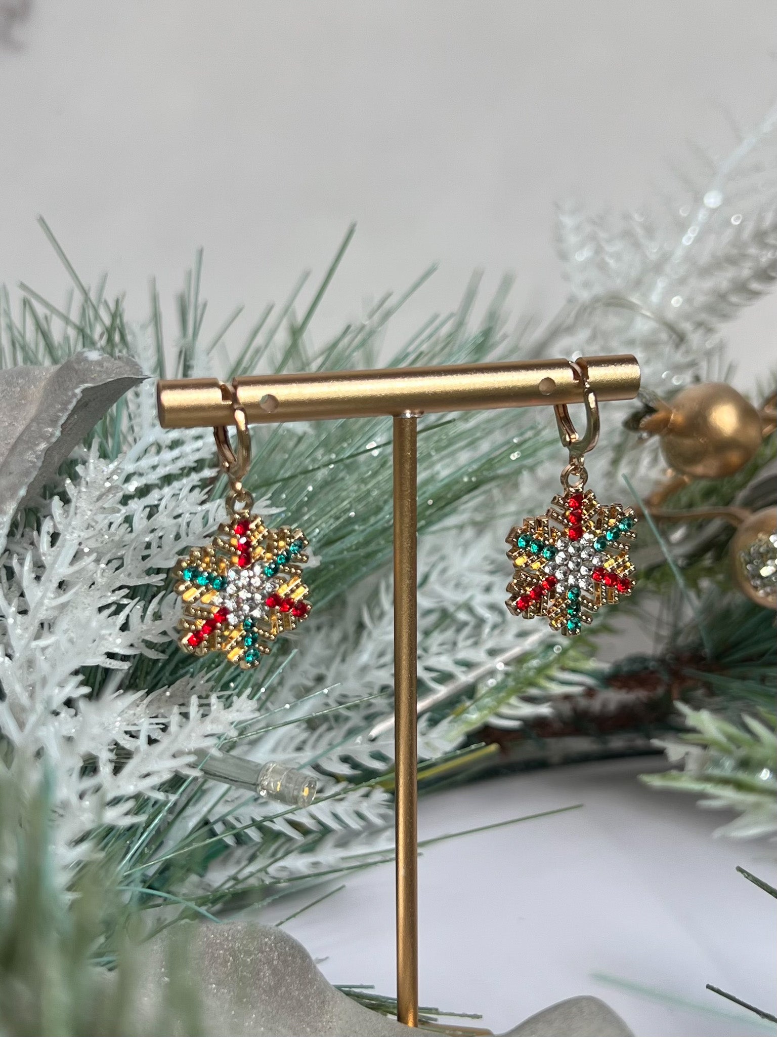 Gold hoops featuring multicolor crystal snowflakes that add a playful, statement shimmer. Bright, bold, and ready to stand out this season.